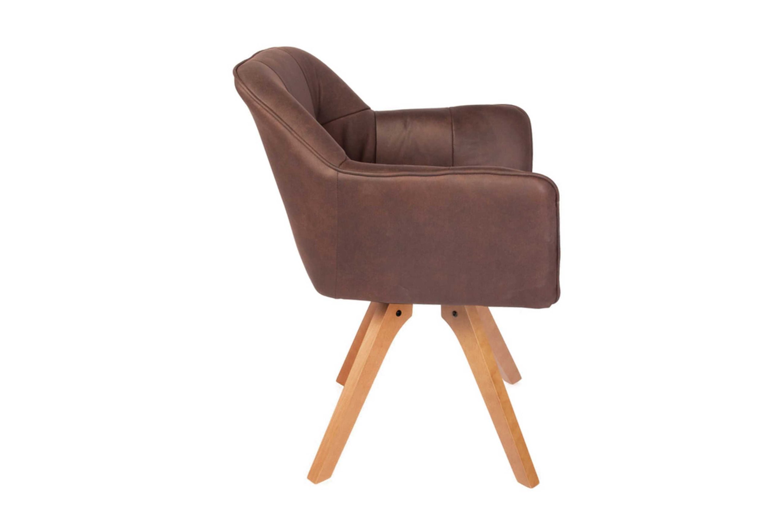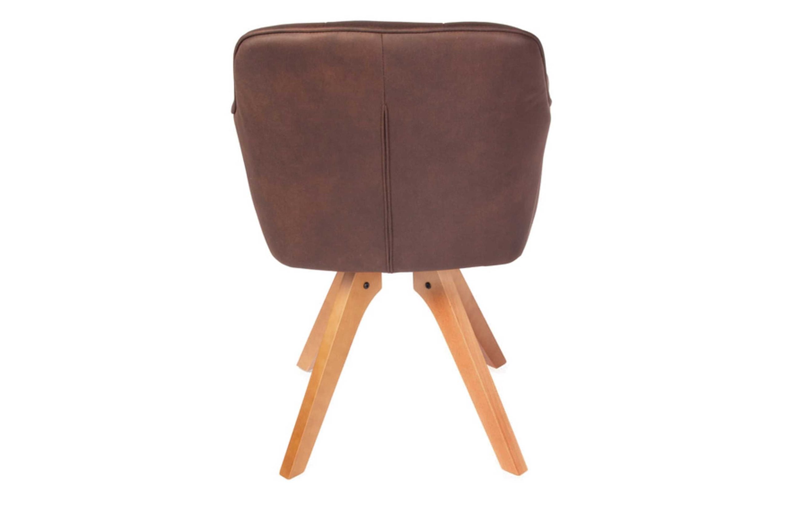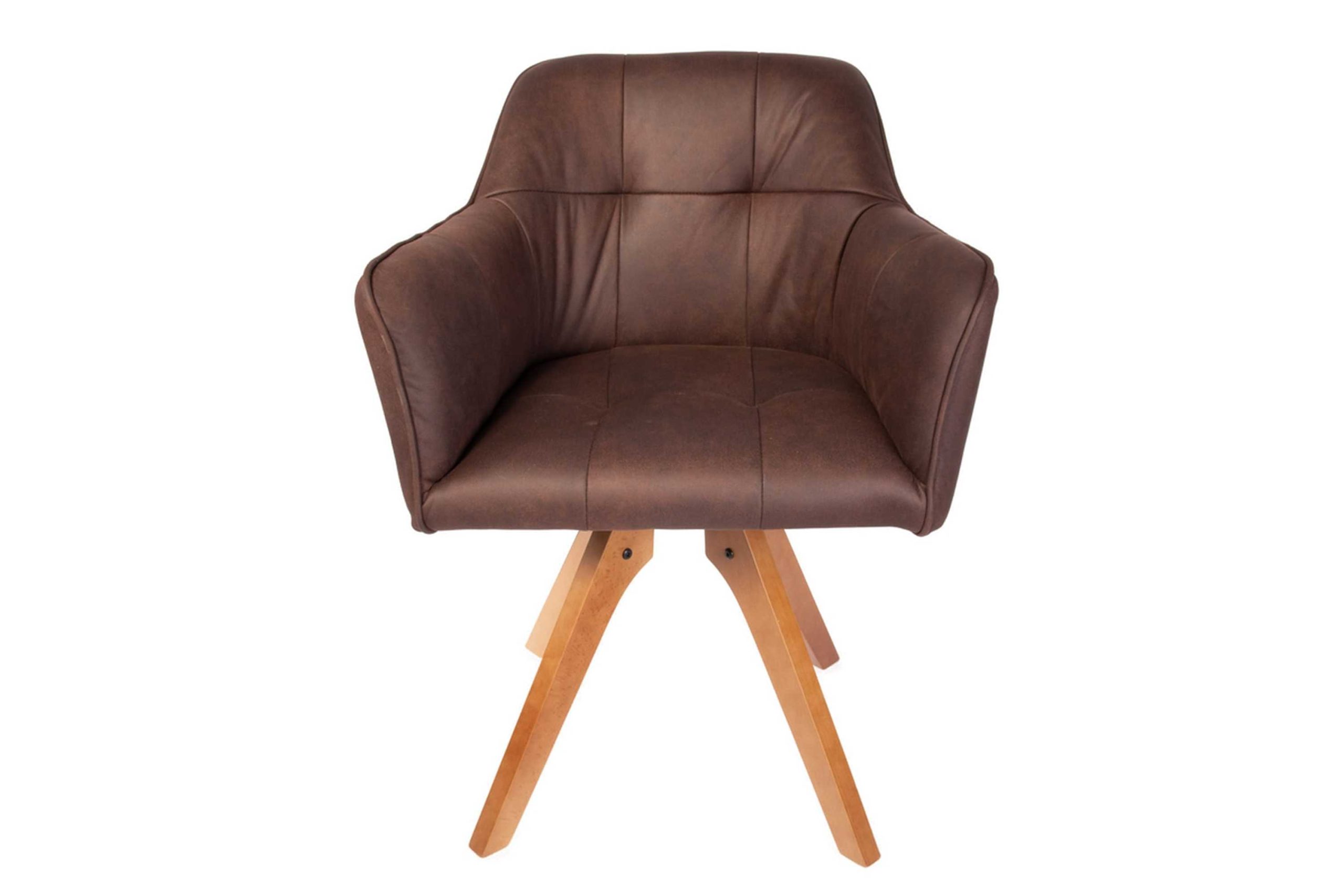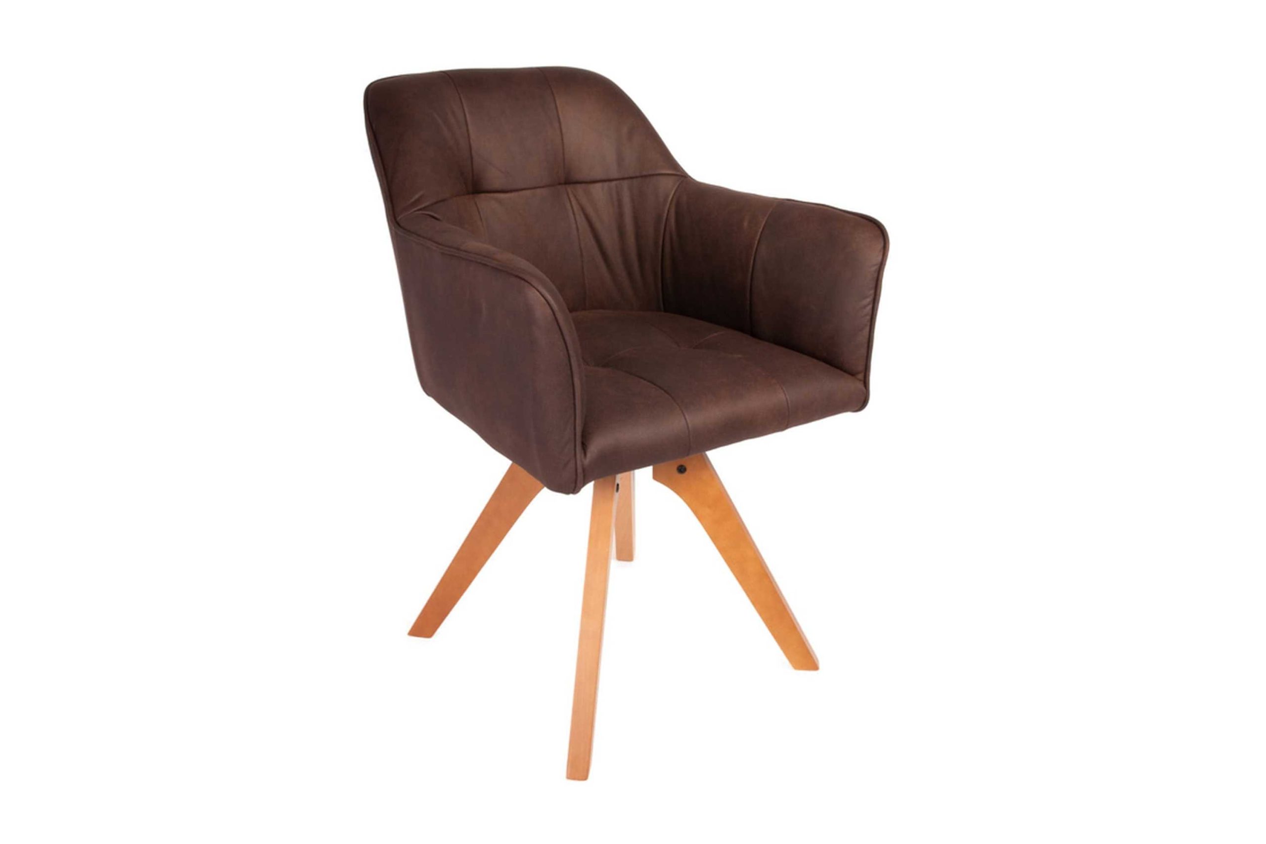 Durch die ergonomisch geformte Rückenlehne und die bequeme Polsterung bietet Ihnen dieses Modell höchsten Sitzkomfort. Nehmen Sie Platz und erleben Sie, wie jedes Beisammensitzen mit der Familie zu einer wahren Freude wird! Die gebeizten Holzfüße bilden einen tollen Kontrast zu dem braunen Stoffbezug in Wildleder-Optik. Absteppungen an der Rückenlehne & Sitzfläche setzen zudem gezielte Akzente und runden das charismatische Gesamtbild des Drehstuhls ab.