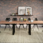 Der trendige Esstisch überzeugt durch eine perfekt gelungene Kombination aus Natürlichkeit und stylischer Moderne. Holen Sie sich dieses Unikat mit individuellem Charakter für Ihr Esszimmer.