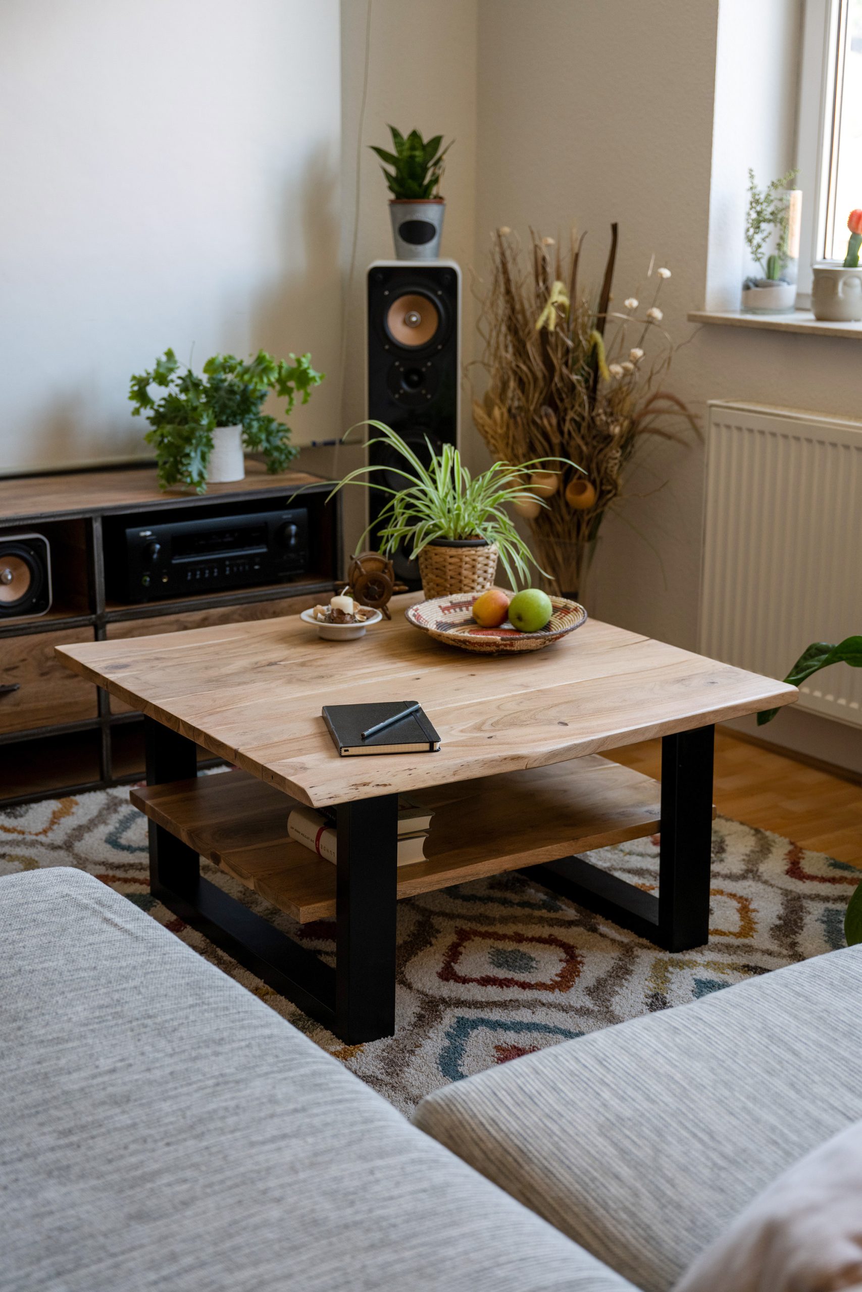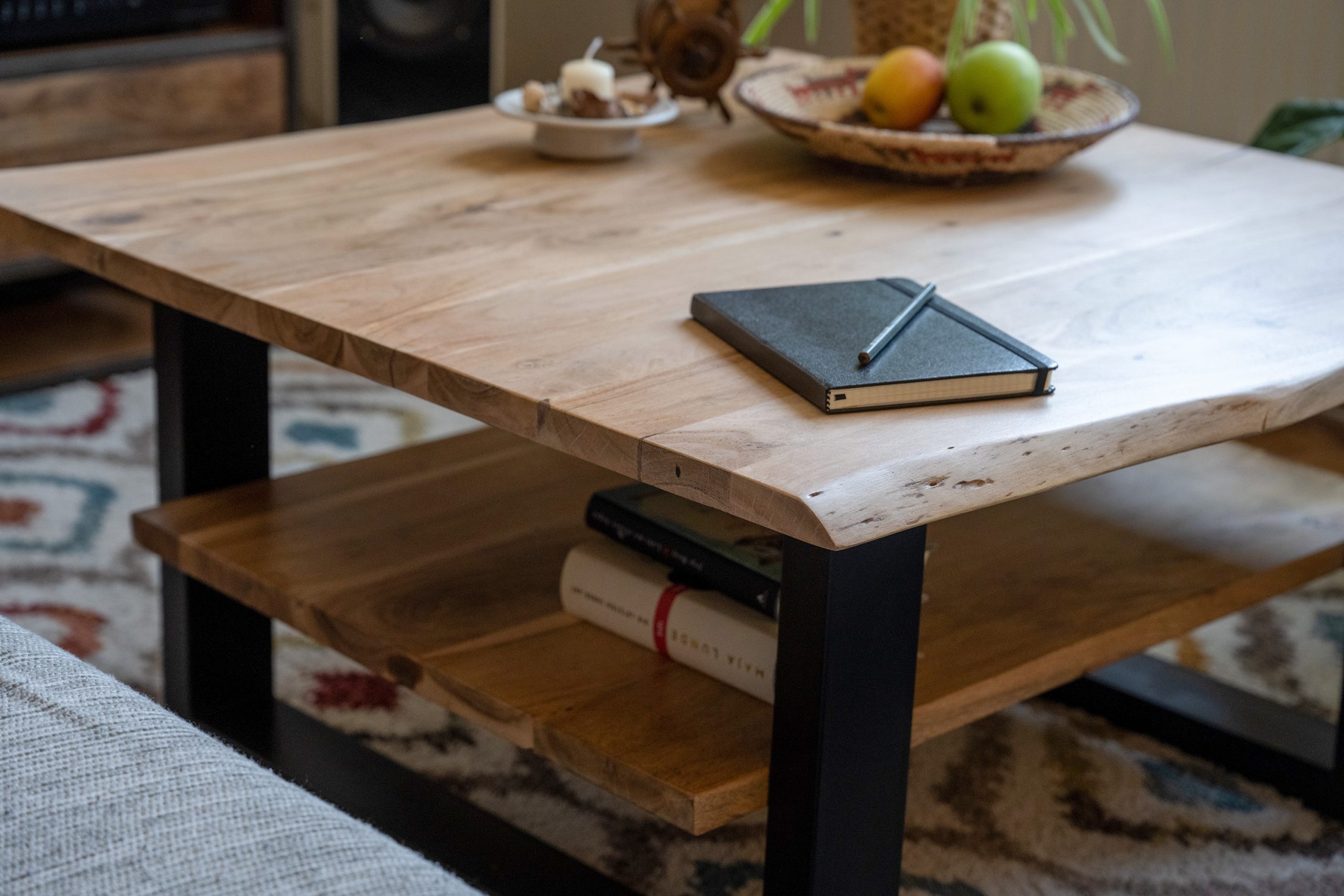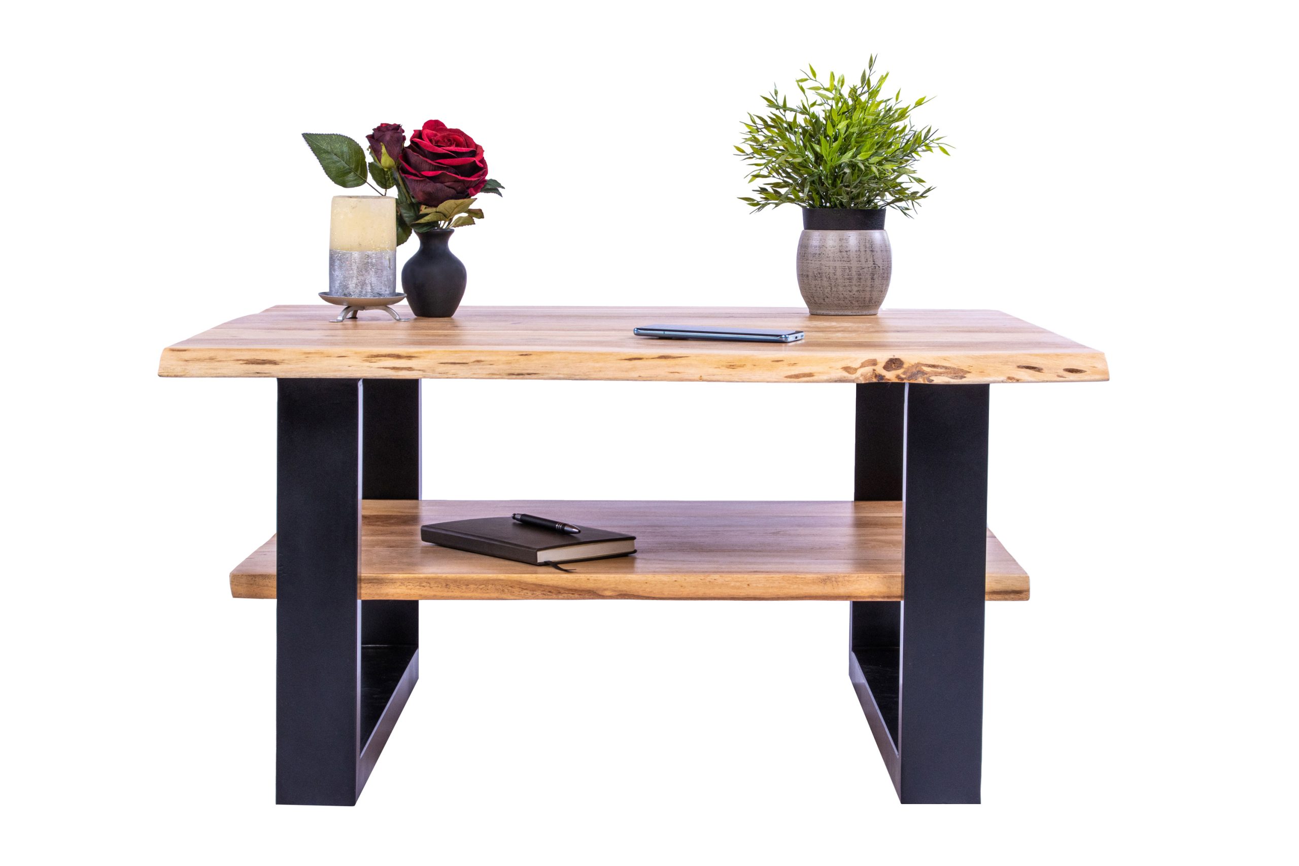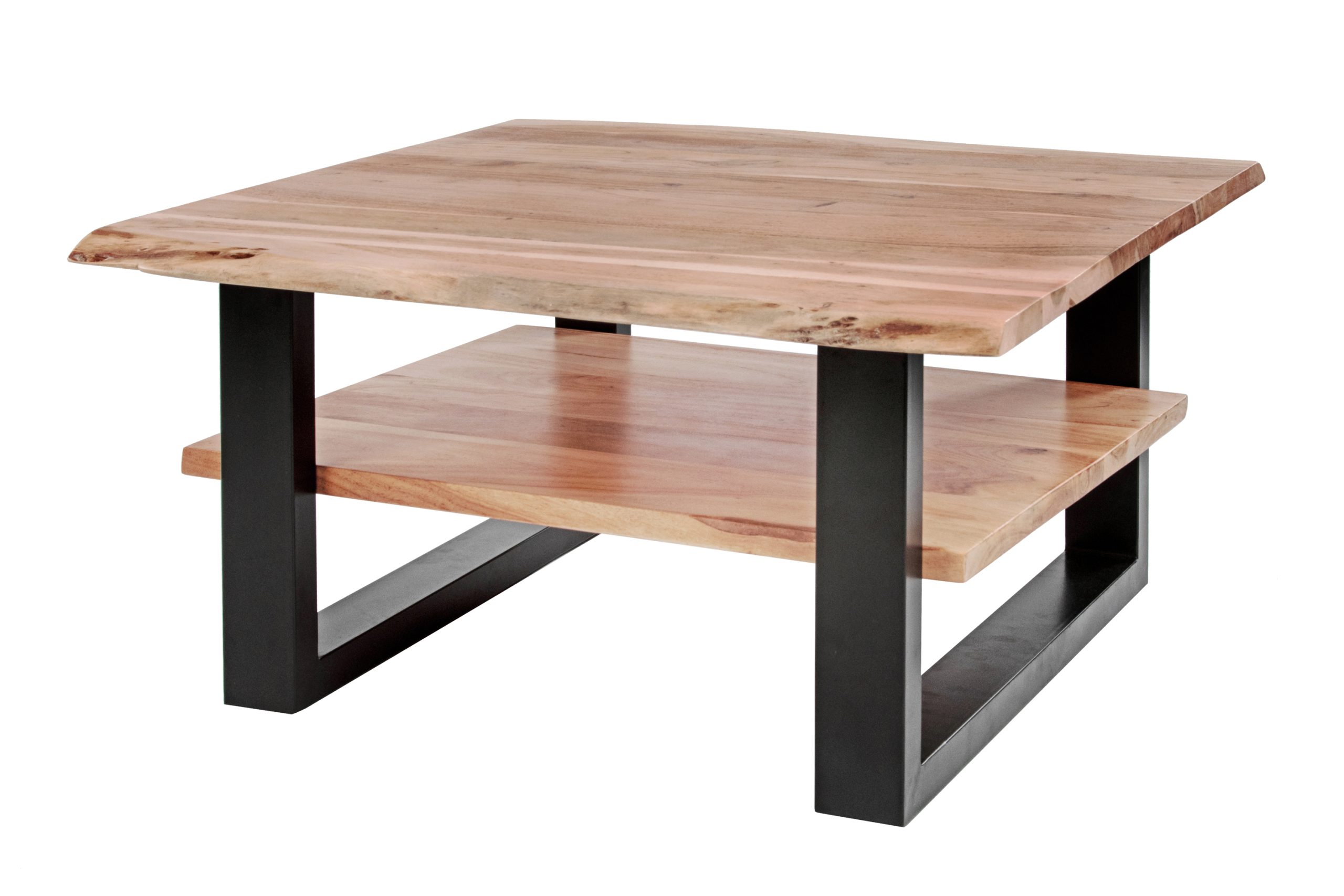 Praktischer Couchtisch Patrick mit Ablage, 90×90 cm, Akazienholz massiv + naturfarben, schwarz lackiertes U-Metallgestell, echte Baumkante