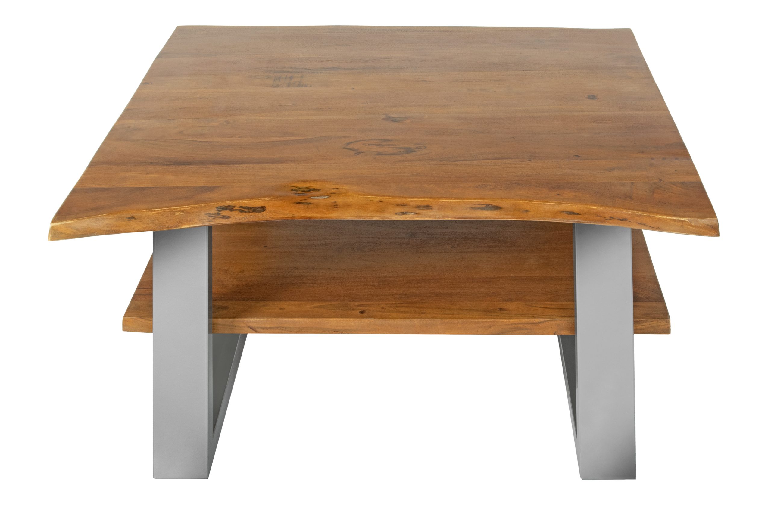 Praktischer Couchtisch Patrick mit Ablage, 90×90 cm, Akazienholz massiv + nussbaumfarben, silber lackiertes U-Metallgestell, echte Baumkante