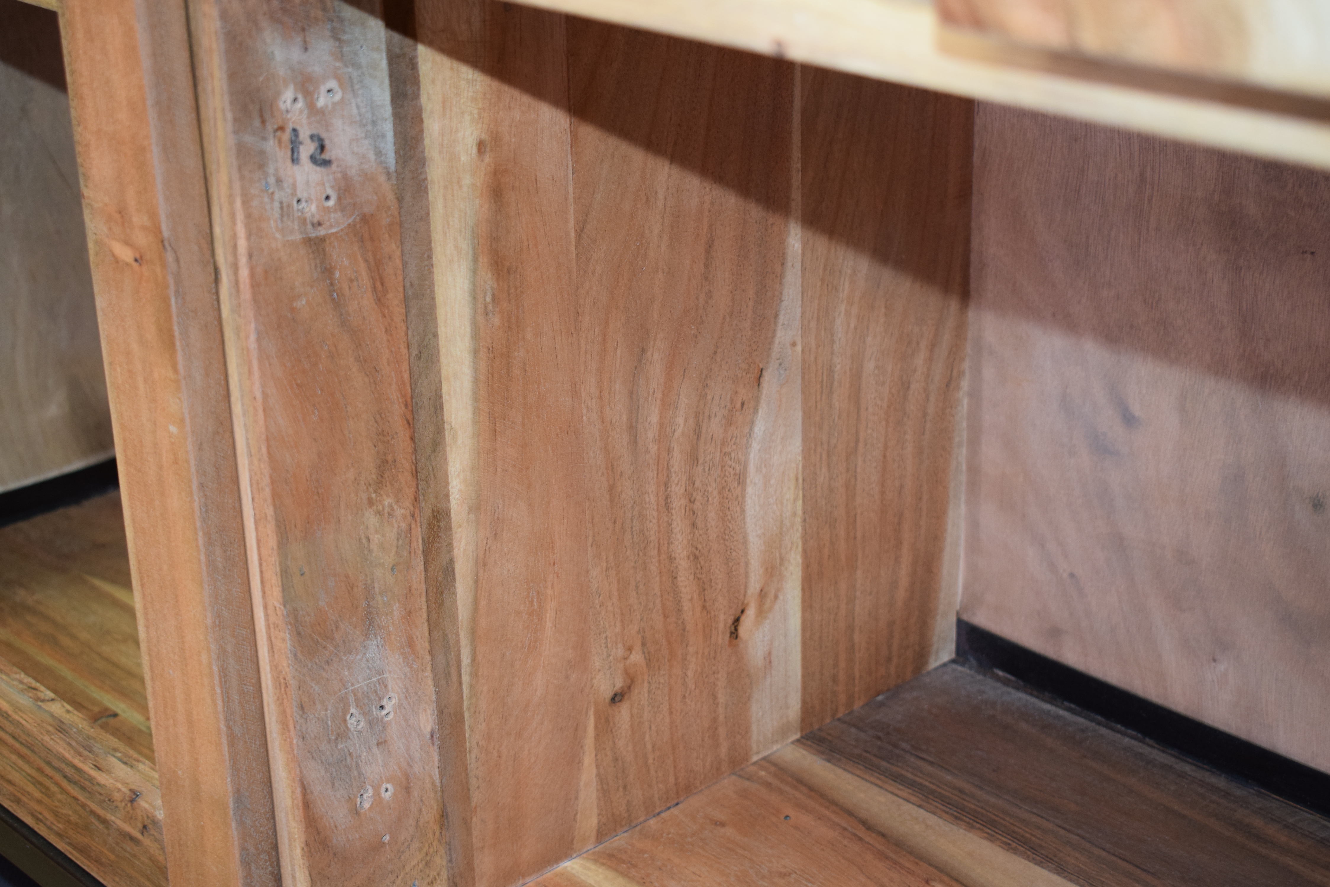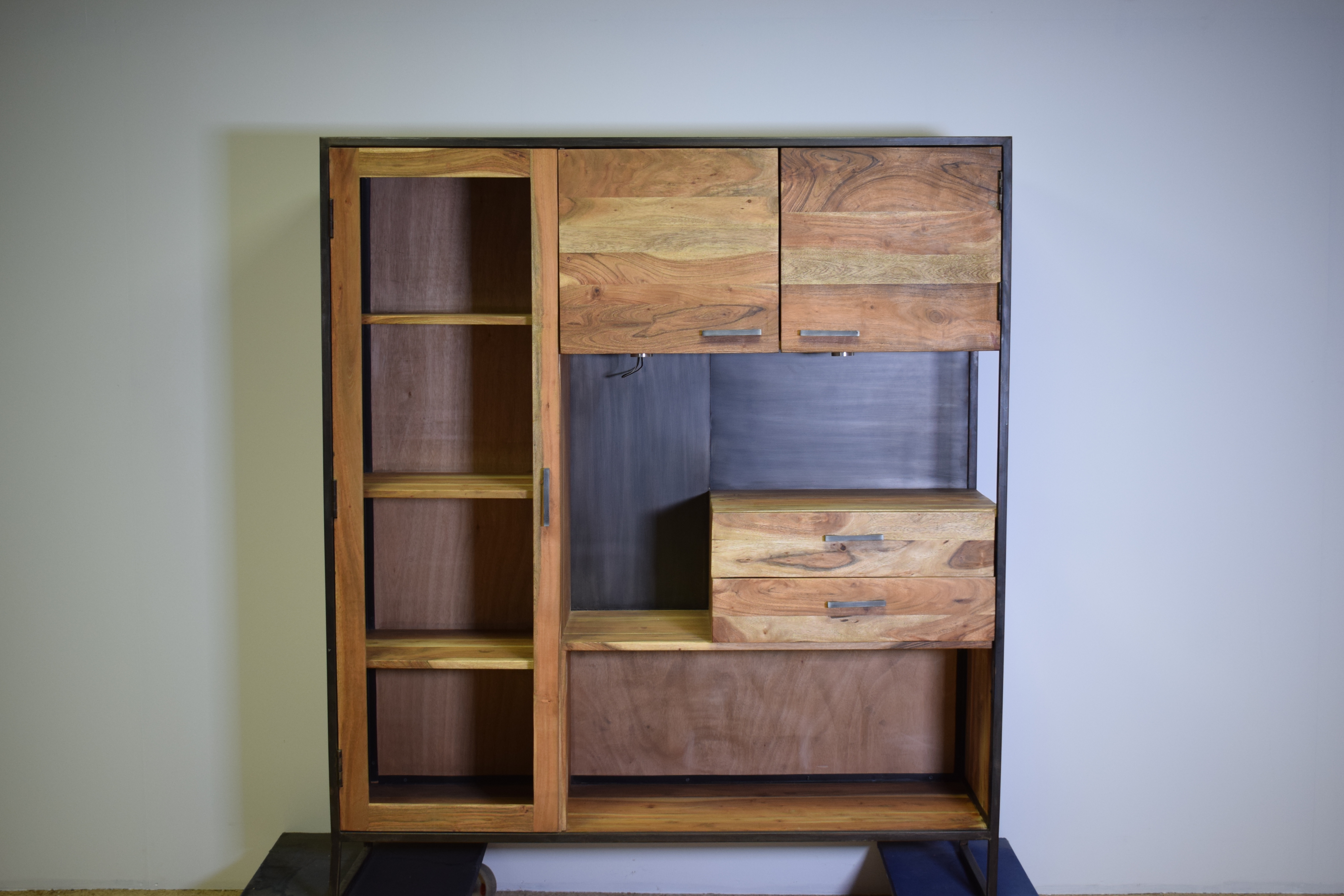 Dieses moderne Highboard verbindet massives Akazienholz mit dunklem Metall und schafft dadurch ein einzigartiges Möbelstück, das Ihrem Wohnraum einen neuen Charakter verleihen wird.