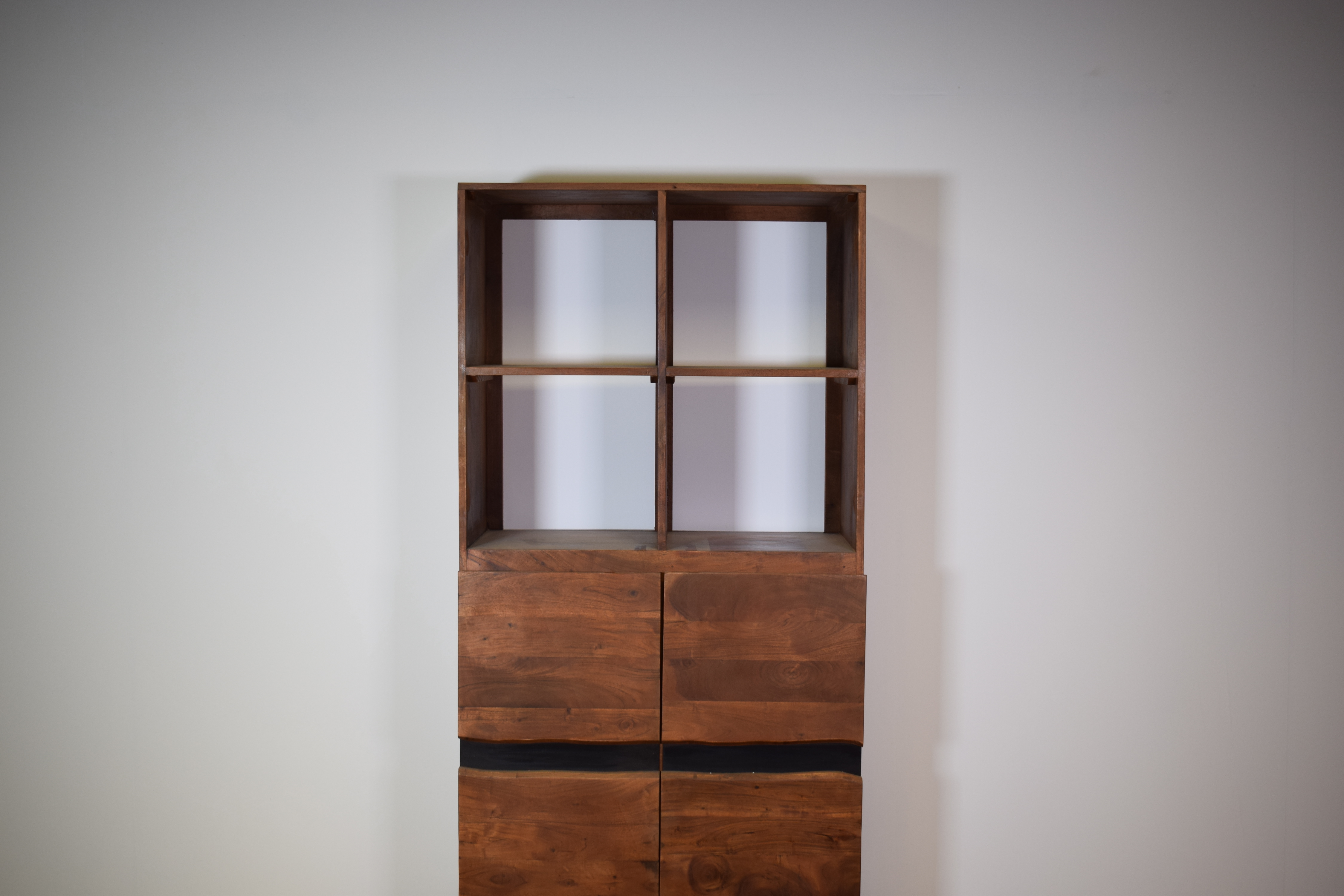 Dieses moderne Highboard verbindet massives Akazienholz mit dunklem Metall und schafft dadurch ein einzigartiges Möbelstück, das Ihrem Wohnraum einen neuen Charakter verleihen wird.