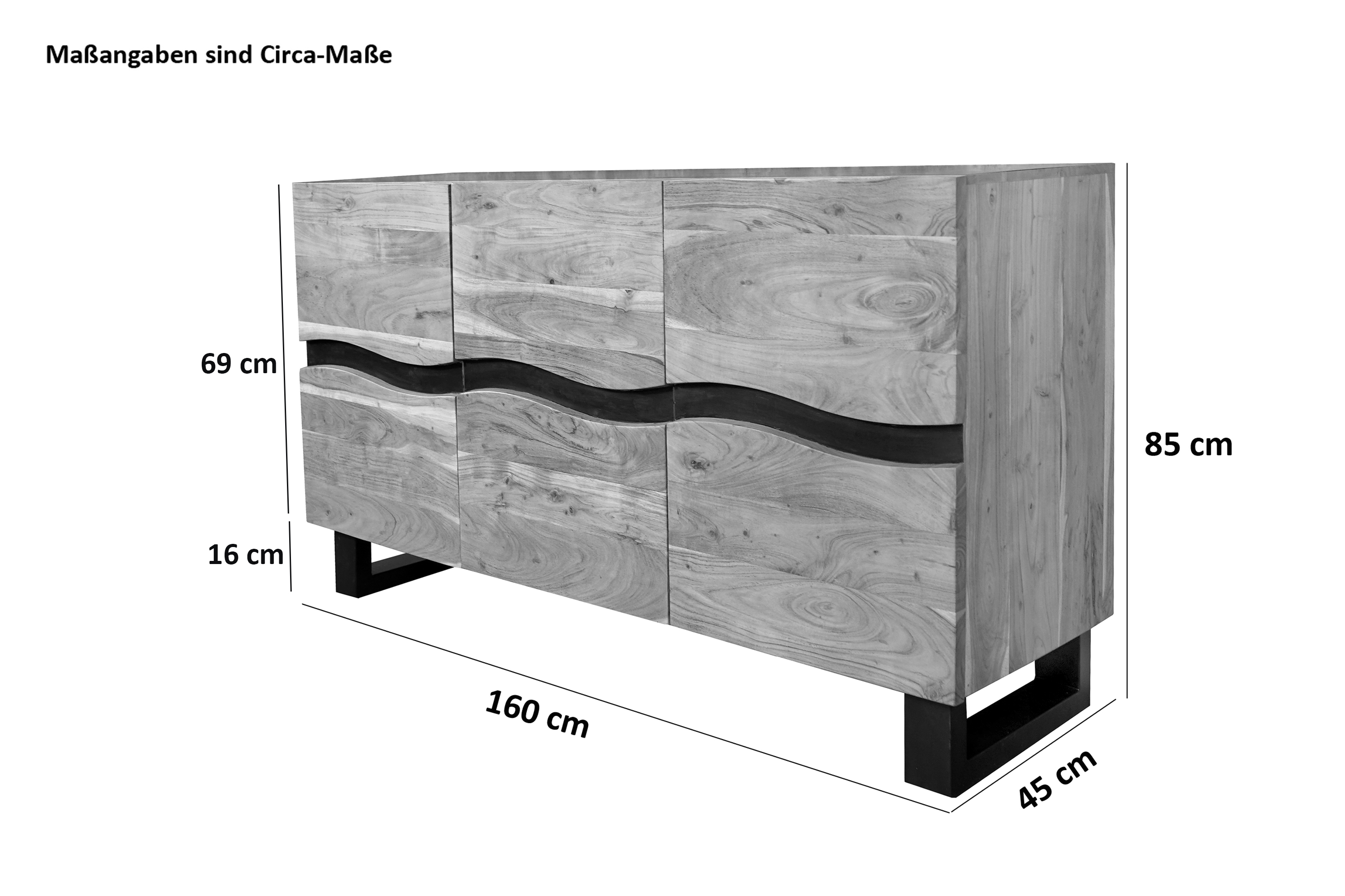 Dieses moderne Sideboard verbindet massives Akazienholz mit dunklem Metall und schafft dadurch ein einzigartiges Möbelstück, das Ihrem Wohnraum einen neuen Charakter verleihen wird.