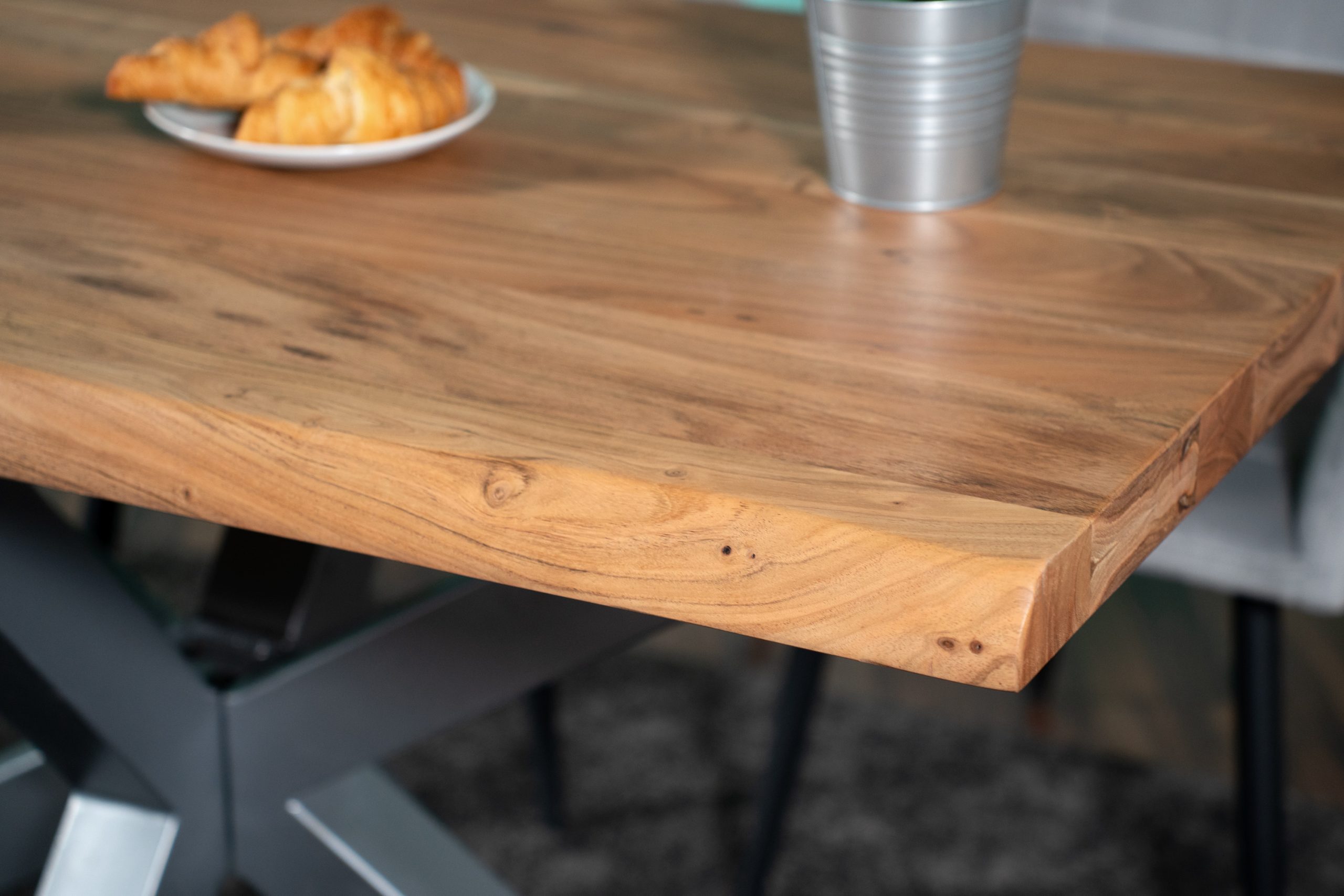 Der Esstisch besteht aus massiven und robusten Akazienholz. Aufgrund der einzigartigen Maserung erhalten Sie ein Unikat mit individuellem Charakter. Das Spider-förmige Gestell sorgt für einen gelungenen Kontrast, welcher dem Massivholztisch einen Hauch von industriellem Look verleiht. Die gesamte Verarbeitung dieses charismatischen und edlen Naturholzes ist sehr schonend sowie naturgerecht, wodurch die Möbel atmungsaktiv bleiben und eine gesunde Wohlfühl-Atmosphäre schaffen.