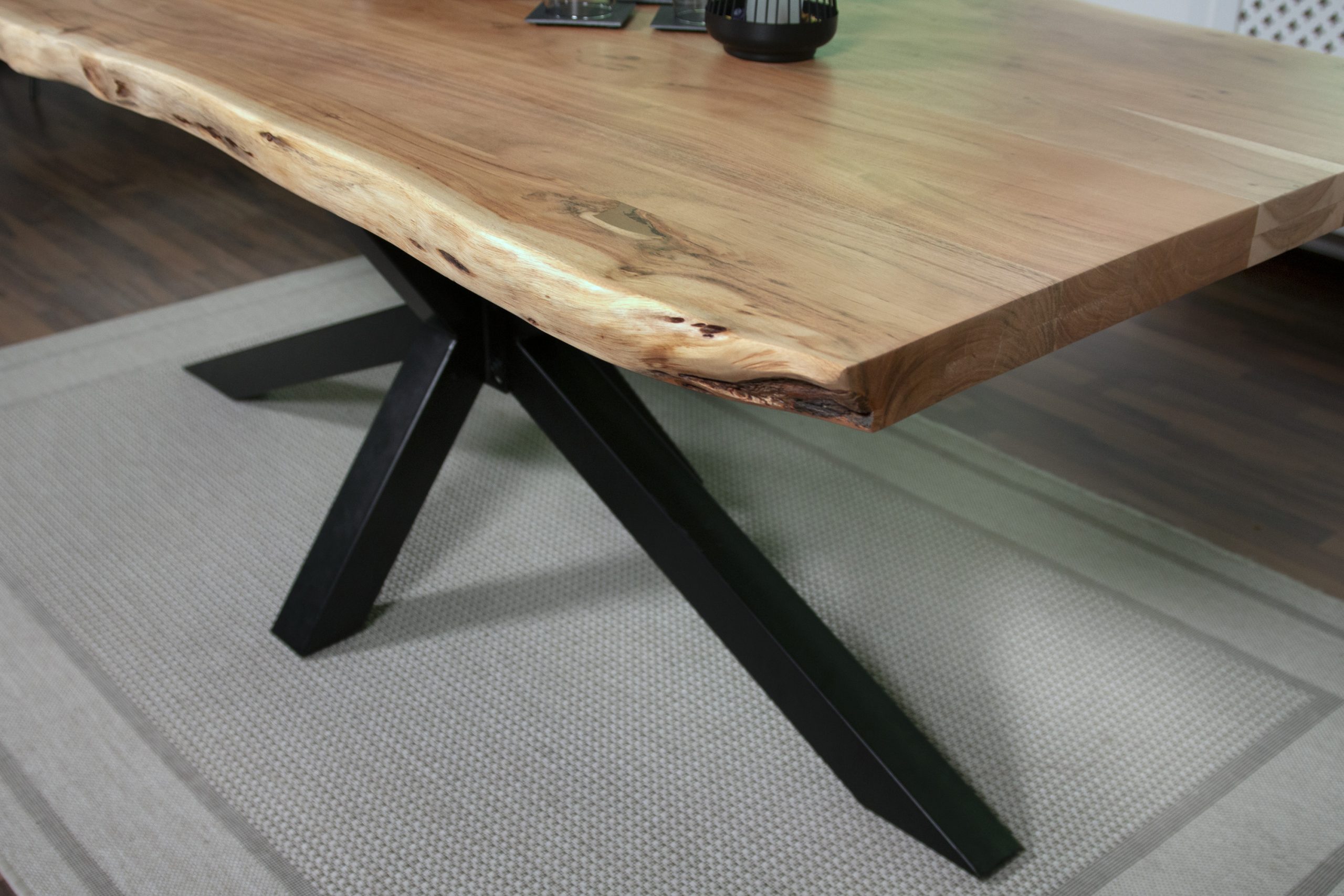 Der Esstisch besteht aus massiven und robusten Akazienholz. Aufgrund der einzigartigen Maserung erhalten Sie ein Unikat mit individuellem Charakter. Das Spider-förmige Gestell sorgt für einen gelungenen Kontrast, welcher dem Massivholztisch einen Hauch von industriellem Look verleiht. Die gesamte Verarbeitung dieses charismatischen und edlen Naturholzes ist sehr schonend sowie naturgerecht, wodurch die Möbel atmungsaktiv bleiben und eine gesunde Wohlfühl-Atmosphäre schaffen.