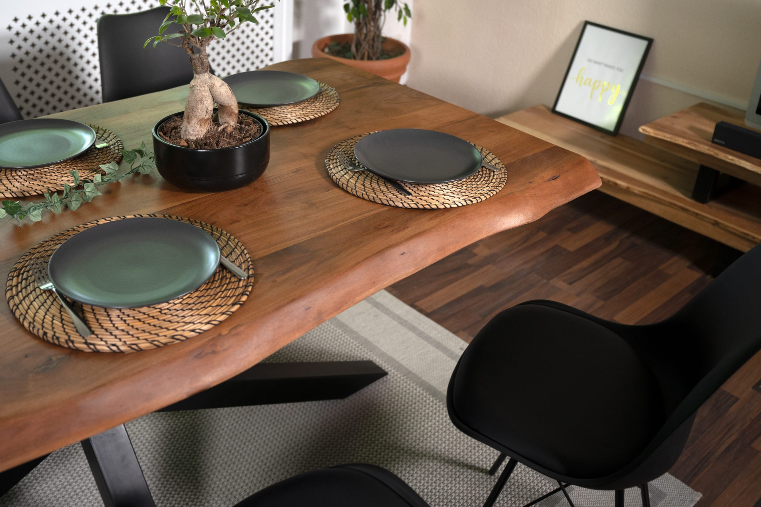 Besonderes Highlight des Esszimmertisches sind die Tischkanten, die den natürlichen Formen eines Baumes entsprechen und direkt aus dem Baumstamm geschnitten wurden.