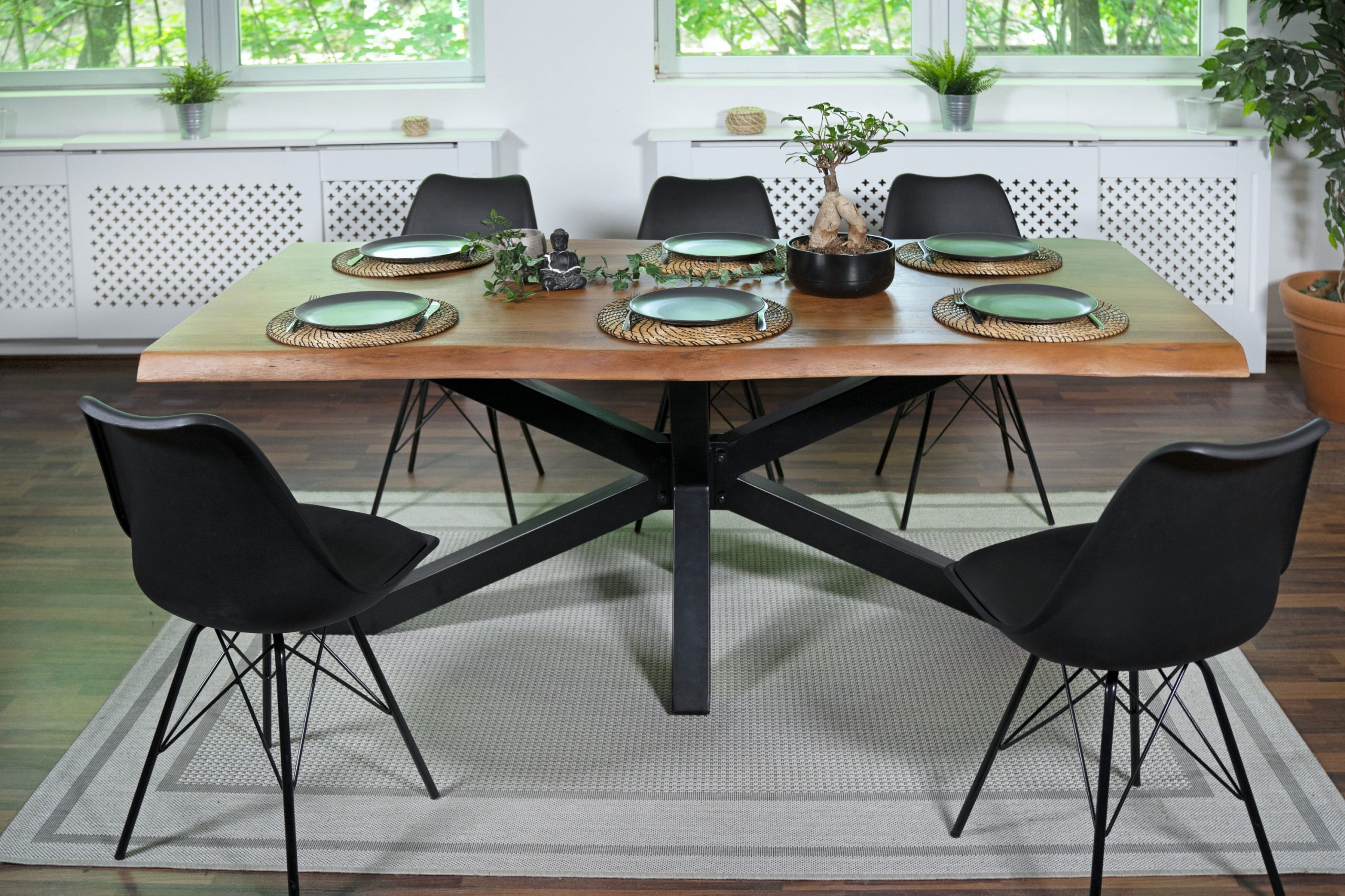 Der Esstisch besteht aus massiven und robusten Akazienholz. Aufgrund der einzigartigen Maserung erhalten Sie ein Unikat mit individuellem Charakter. Das Spider-förmige Gestell sorgt für einen gelungenen Kontrast, welcher dem Massivholztisch einen Hauch von industriellem Look verleiht. Die gesamte Verarbeitung dieses charismatischen und edlen Naturholzes ist sehr schonend sowie naturgerecht, wodurch die Möbel atmungsaktiv bleiben und eine gesunde Wohlfühl-Atmosphäre schaffen.