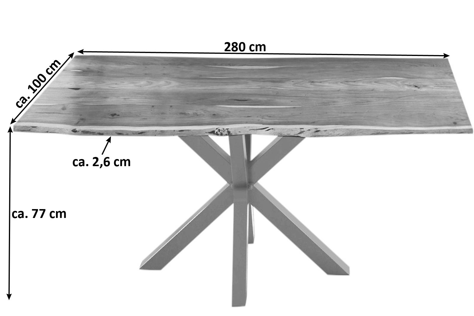 - Länge: 280 cm | Breite: ca. 100 cm | Gesamthöhe: ca. 77 cm | Tischplatte: ca. 2,6 cm