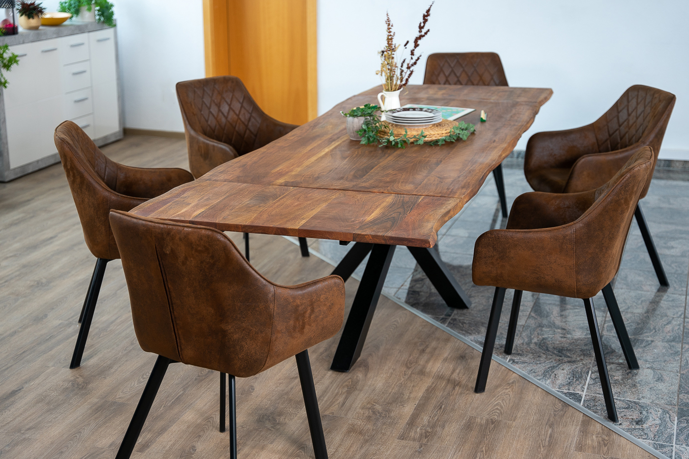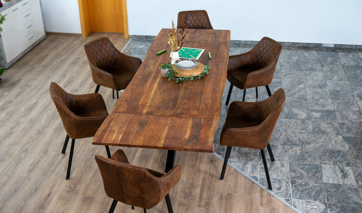 Erweiterbarer Esstisch durch Ansteckplatten. Ihr persönliches Baumkantenmöbelstück aus einem der robustesten Hölzer der Welt – Akazie!