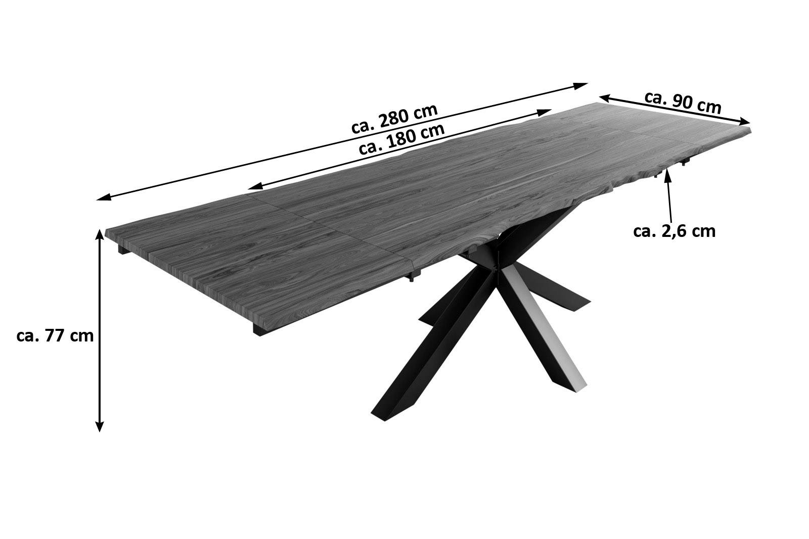 Der Holztisch im Industrial-Stil kommt mit zwei Ansteckplatten mit denen dieser auf bis zu 280 x 90 cm erweitert werden kann. Das Spider-Gestell verleiht dem Massivholztisch einen Hauch von industriellem Look. Aufgrund der einzigartigen Maserungen, Farbnuancen und Kantenausprägungen erhalten Sie ein Unikat mit individuellem Charakter. Verschmutzungen mit einem angefeuchteten, fusselfreien Tuch entfernen – anschließend trocken reiben.