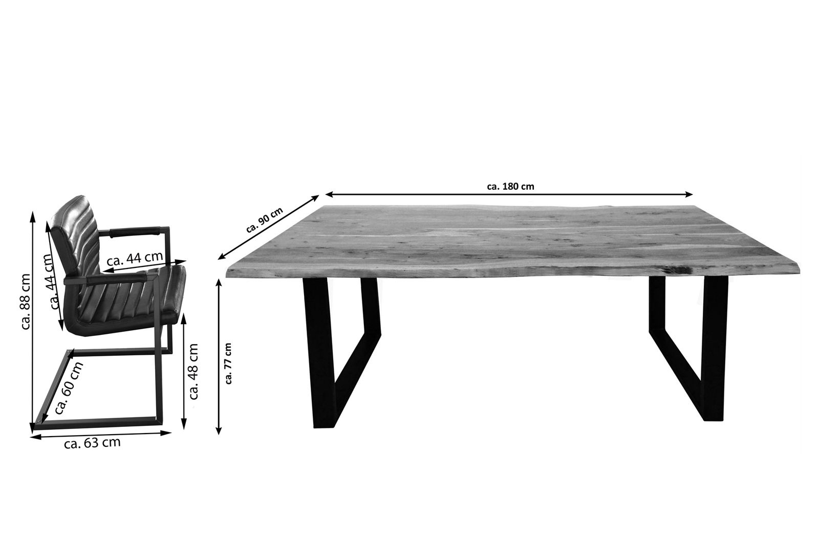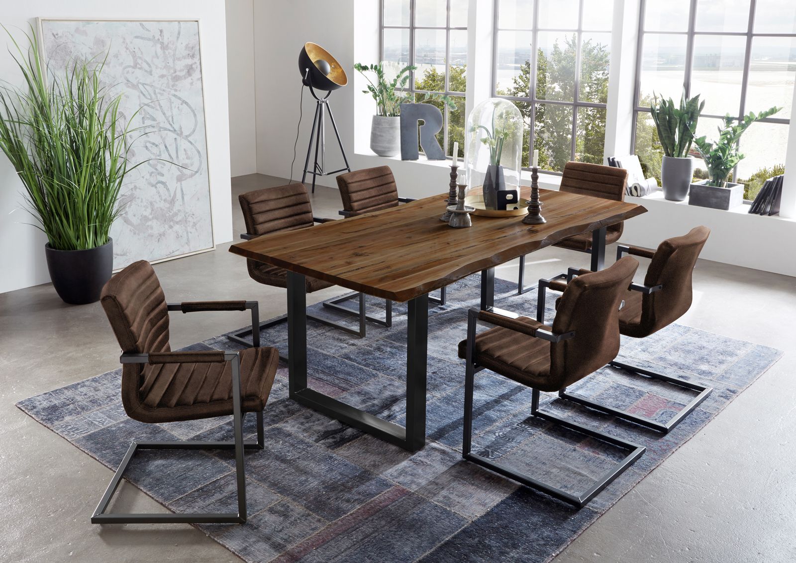 7tlg. Essgruppe Noah, Esstisch 180x90cm, U-Gestell schwarz + 6x Freischwinger Parzivo in Wildlederoptik, Naturholz massiv