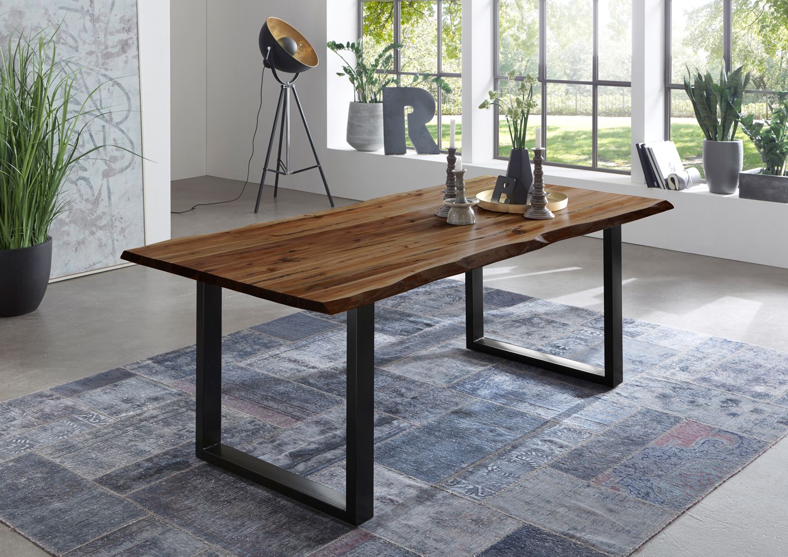 Die Tischkanten wurden aus dem Baumstamm herausgeschnitten und sind exakt so beibehalten, wie der Baum einmal gewachsen ist. Die Beine aus Metall sind ein besonderes Highlight. Denn das elegante U-Gestell aus hochwertigem Roheisen setzt gezielte Akzente im Industrial-Design. Durch diese Kombination wirkt der Tisch sowohl gemütlich rustikal als auch modern und fügt sich perfekt in jedes Ambiente ein.