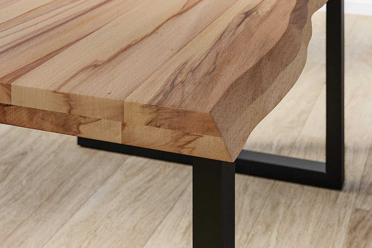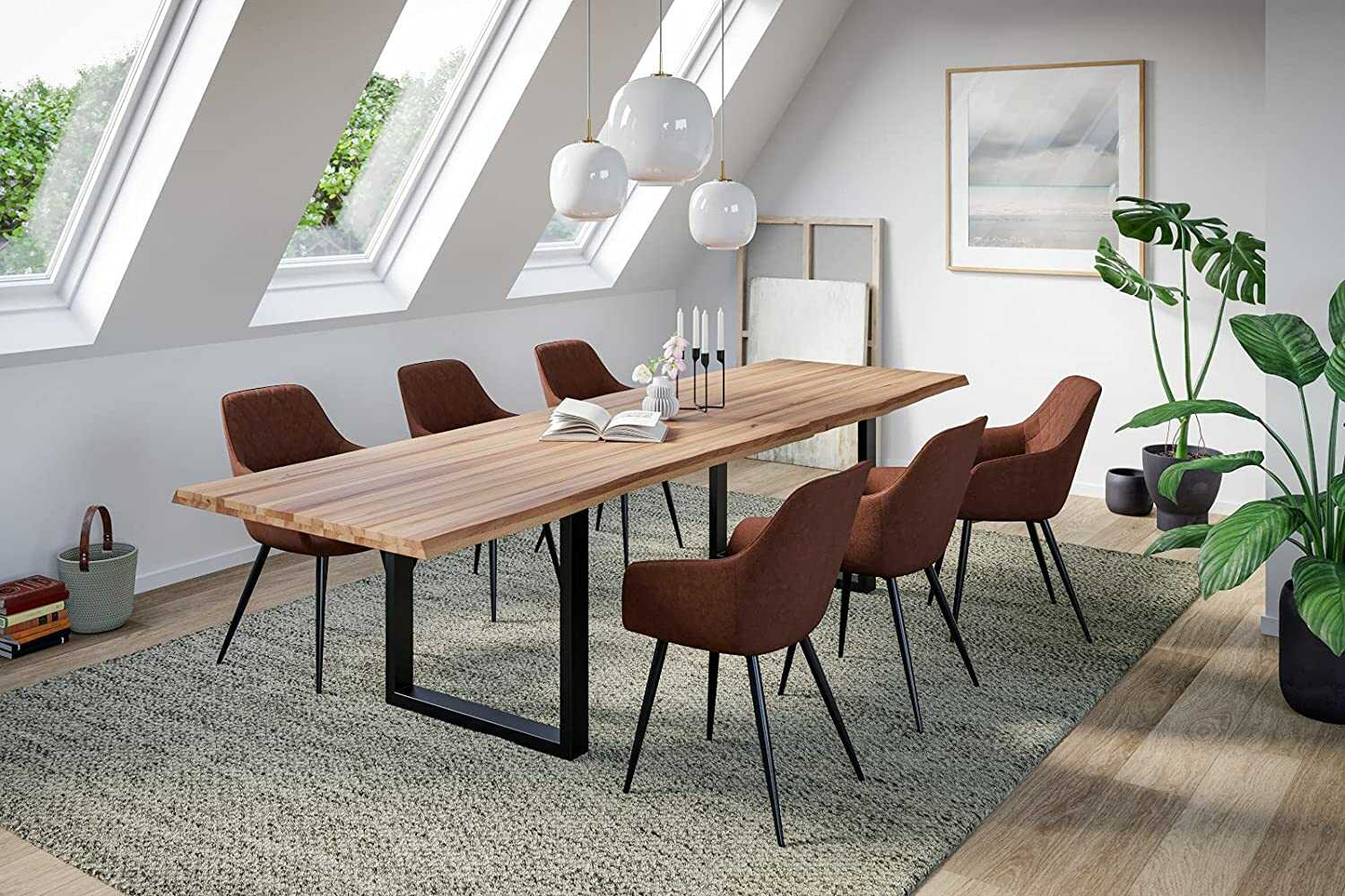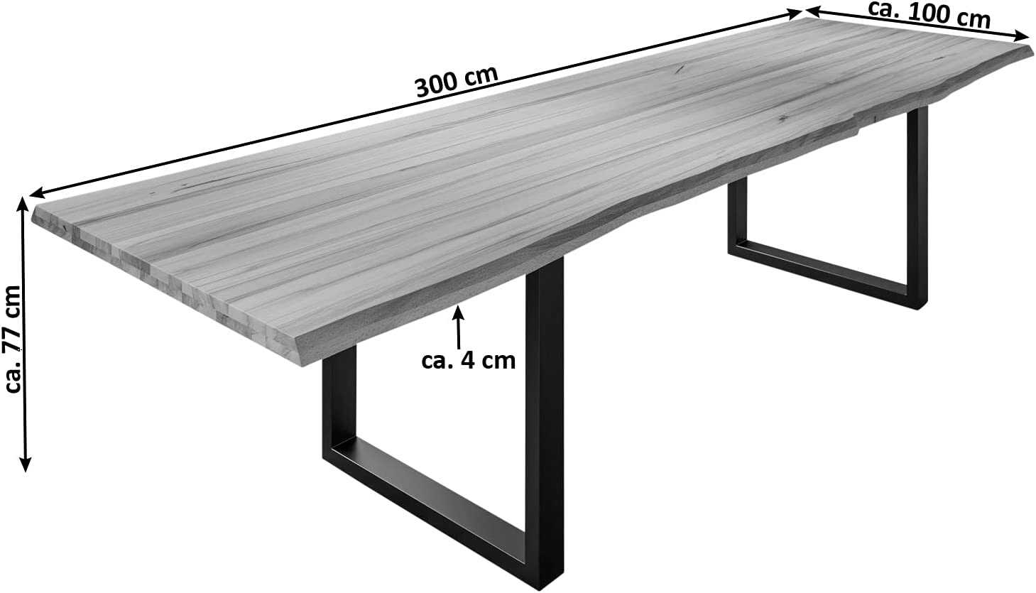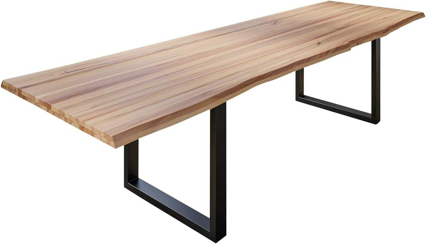 Der trendige Esstisch überzeugt durch eine perfekt gelungene Kombination aus Natürlichkeit und stylischer Moderne. Besonderes Highlight des Esszimmertisches sind die Tischkanten, die den natürlichen Formen eines Baumes entsprechen und direkt aus dem Baumstamm geschnitten wurden. Das U-förmige Gestell sorgt für einen gelungenen Kontrast, welcher dem Massivholz-Tisch einen Hauch von industriellem Look verleiht.