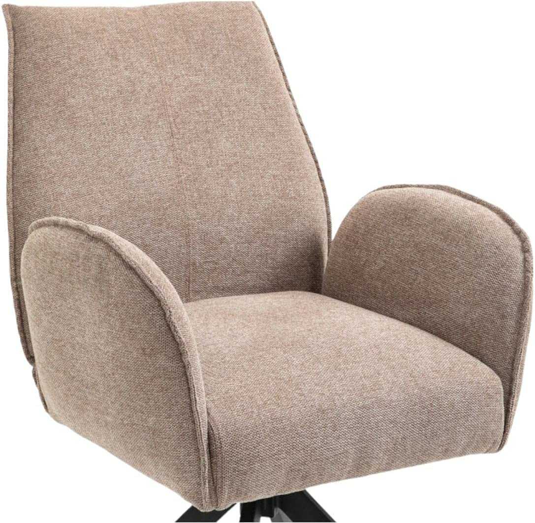 Der um 180° drehbare Essstuhl hat eine gepolsterte, ergonomisch geformte Rückenlehne. Die schwarzen Metallfüße bilden einen tollen Kontrast zu dem Lattefarbenen Stoffbezug. Die gepolsterte Sitz- sowie Rückenfläche, die gemütlichen Armlehnen und die ergonomische Form des Stuhls bieten Ihnen ein angenehmes Sitzgefühl. Die Absteppungen an der Rückenlehne setzen zudem gezielte Akzente und runden das charismatische Gesamtbild des Drehstuhls.