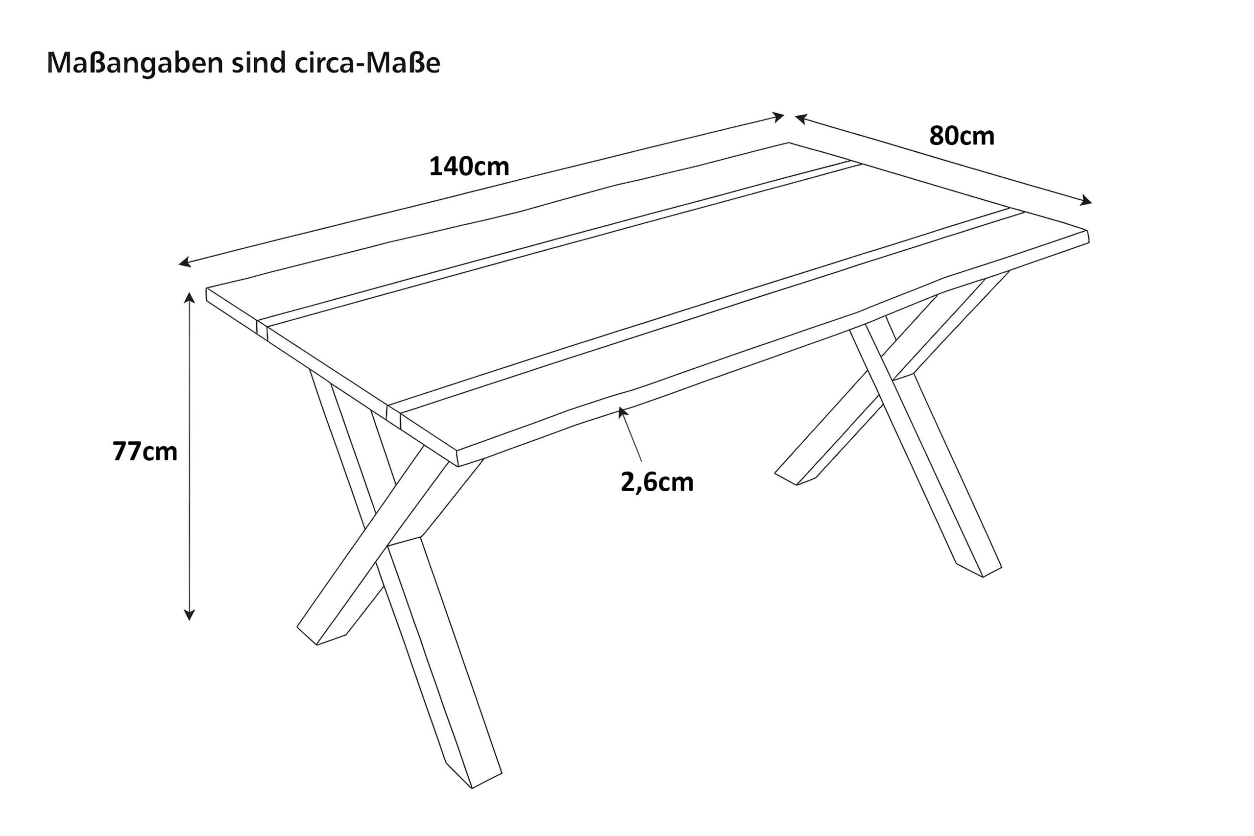 - Länge: 140 cm | Breite: ca. 80 cm | Gesamthöhe: ca. 77 cm | Tischplattenstärke: ca. 2,6 cm