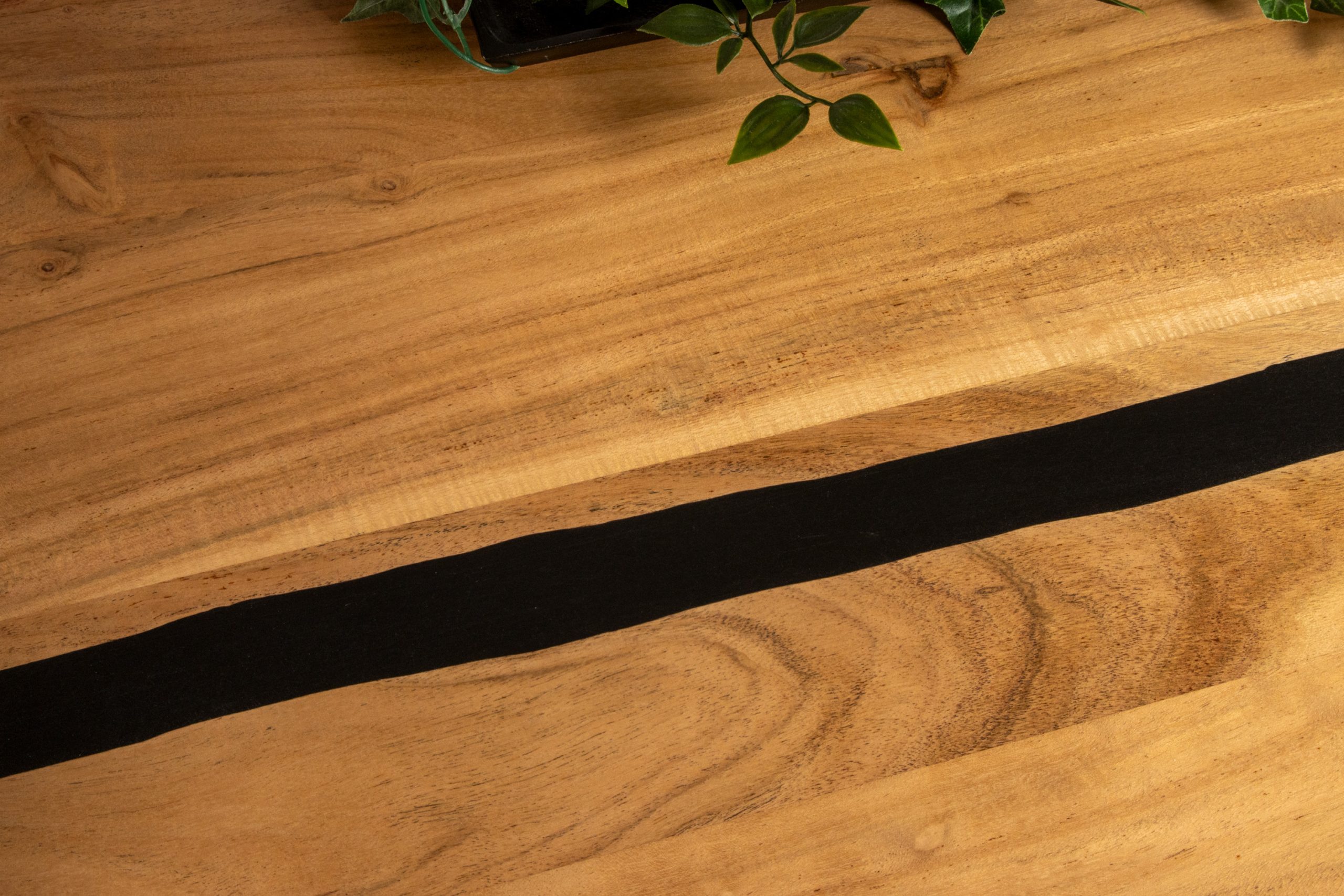 Die zwei geschwungenen Epoxidharz-Streifen in Schwarz verlaufen über die gesamte Tischplatte und erzeugen einen fließenden, stilvollen Kontrast zur natürlichen Holzmaserung. Jedes Modell ist durch seine individuelle Maserung und Kantenführung ein echtes Unikat. Akazienholz ist bekannt für seine außergewöhnliche Widerstandsfähigkeit, hohe Härte und lebendige Maserung. Durch die naturbelassene Optik bleibt die authentische Holzstruktur erhalten, während die Oberfläche mit einer Lackierung versiegelt ist, um die Langlebigkeit zu gewährleisten und das Eindringen von Flüssigkeiten zu verhindern.