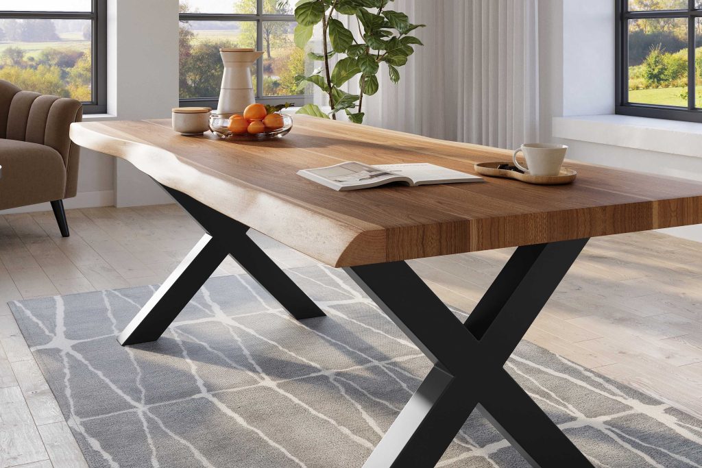 Der Esszimmertisch vereint natürliche Eleganz mit modernem Industrial-Design. Die massive Akazienholzplatte mit echter Baumkante bringt die natürliche Schönheit des Holzes perfekt zur Geltung. Das X-förmige Metallgestell bietet eine harmonische Kombination aus Stabilität und Stil, die Ihren Essbereich aufwertet.