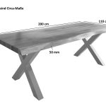Das X-Gestell aus Metall bildet einen stilvollen Kontrast zum warmen Massivholz und sorgt für Stabilität sowie wackelfreien Stand. Dank der natürlichen Holzmerkmale wie Astlöchern und Farbnuancen erhält jeder Tisch einen individuellen Charakter. Perfekt für Liebhaber von exklusiven Möbelstücken.