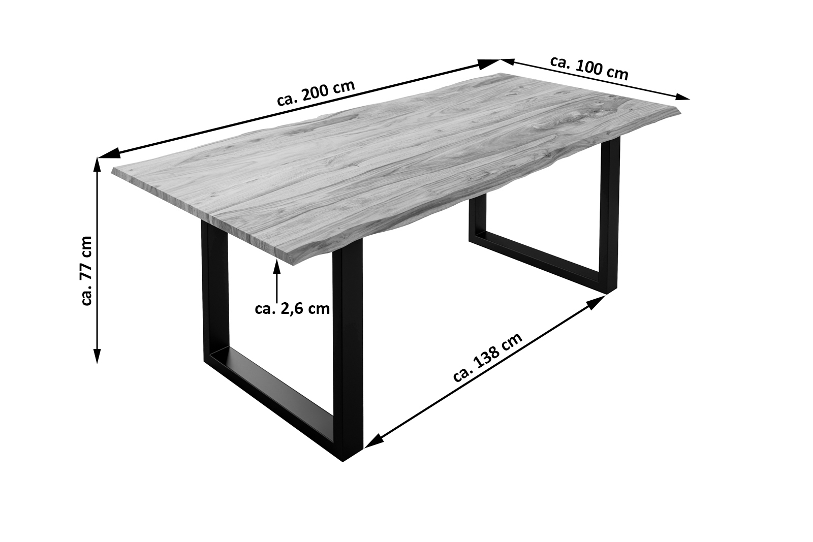 - Länge: 200 cm | Breite: ca. 100 cm | Gesamthöhe: ca. 77 cm | Tischplatte: ca. 2,6 cm | Gestellstärke: ca. 8 x 4 cm