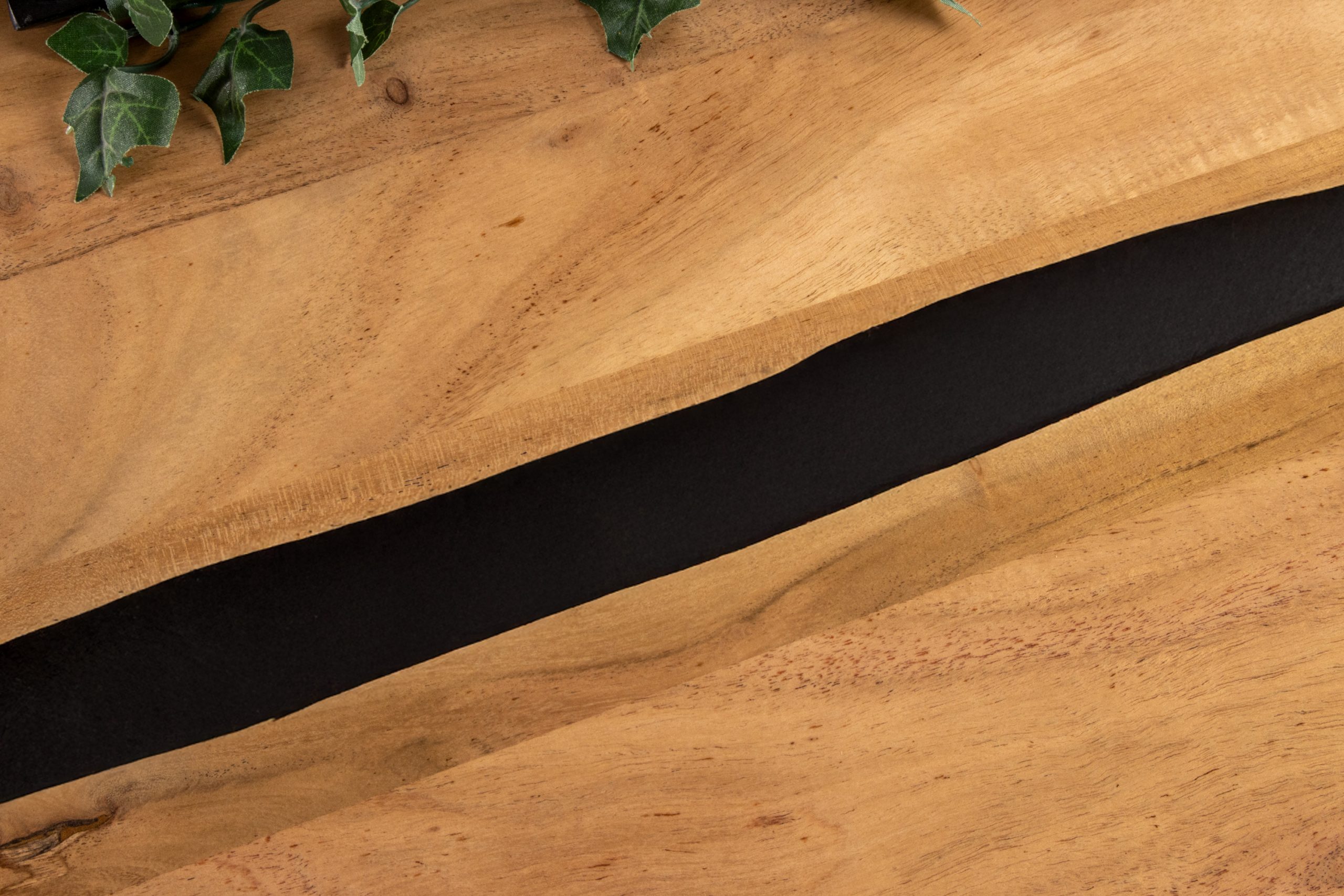Die zwei geschwungenen Epoxidharz-Streifen in Schwarz verlaufen über die gesamte Tischplatte und erzeugen einen fließenden, stilvollen Kontrast zur natürlichen Holzmaserung. Jedes Modell ist durch seine individuelle Maserung und Kantenführung ein echtes Unikat. Akazienholz ist bekannt für seine außergewöhnliche Widerstandsfähigkeit, hohe Härte und lebendige Maserung. Durch die naturbelassene Optik bleibt die authentische Holzstruktur erhalten, während die Oberfläche mit einer Lackierung versiegelt ist, um die Langlebigkeit zu gewährleisten und das Eindringen von Flüssigkeiten zu verhindern.