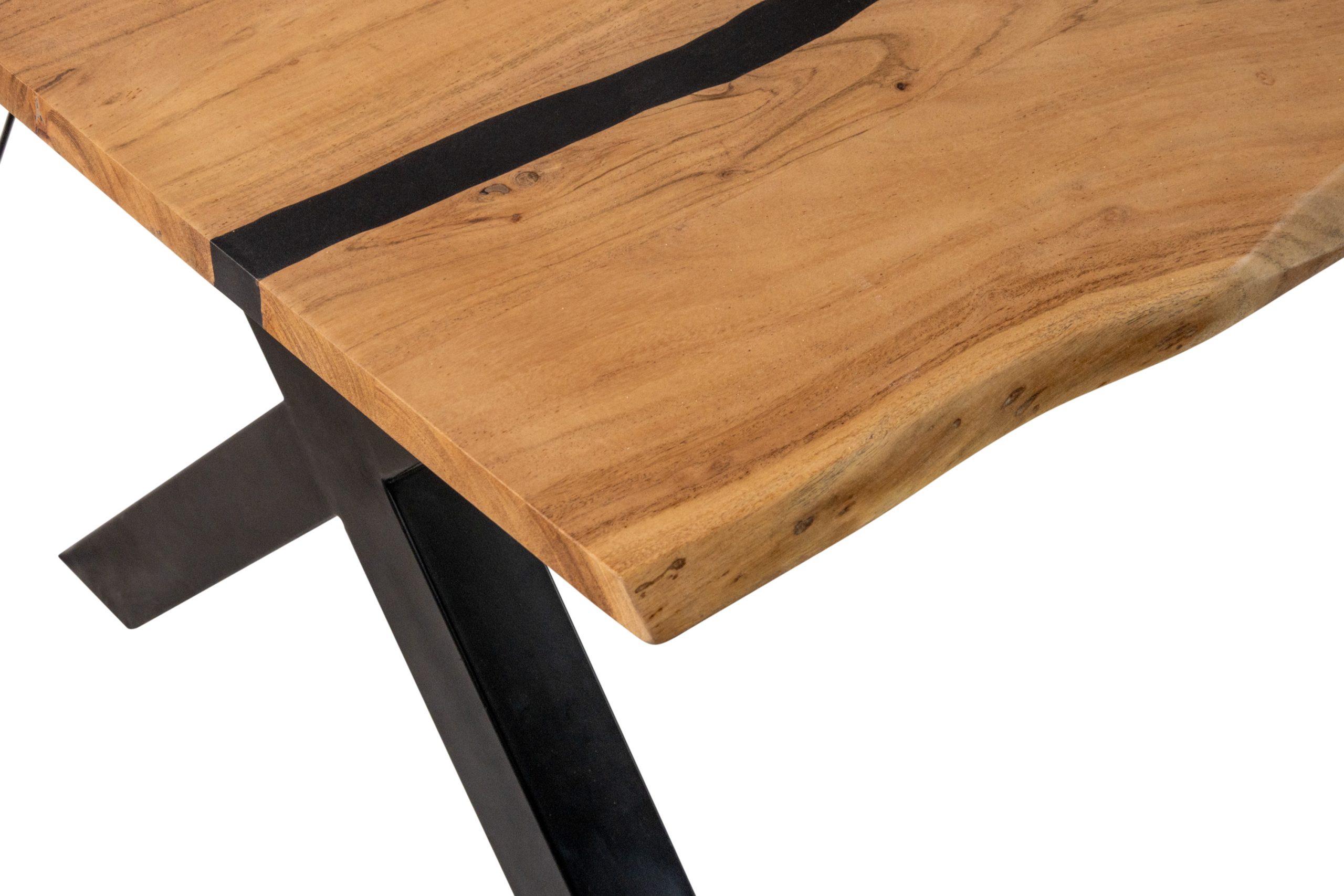 Esstisch Pedro | Akazienholz | Farbe: Natur | Resin-Adern | echte Baumkante | X-Gestell Metall schwarz | 220 x 100 cm