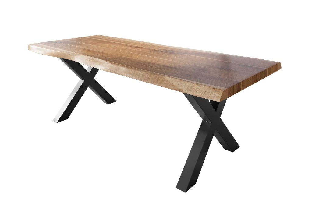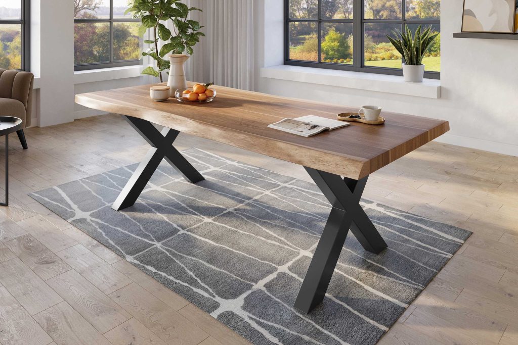 Der Esszimmertisch vereint natürliche Eleganz mit modernem Industrial-Design. Die massive Akazienholzplatte mit echter Baumkante bringt die natürliche Schönheit des Holzes perfekt zur Geltung. Das X-förmige Metallgestell bietet eine harmonische Kombination aus Stabilität und Stil, die Ihren Essbereich aufwertet.