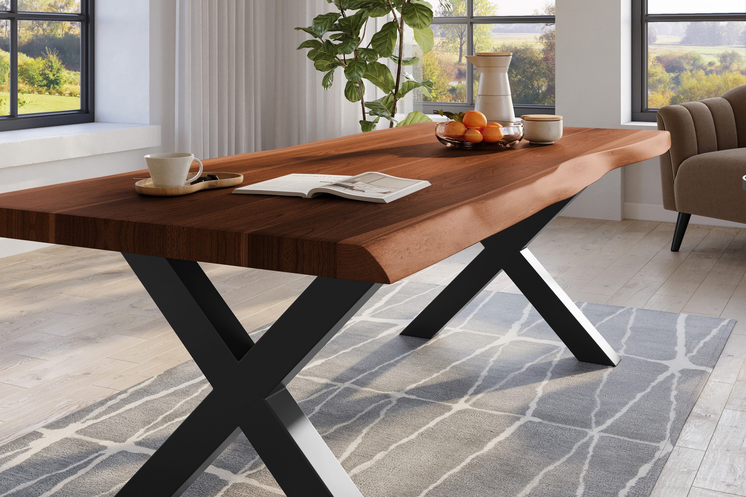 Esszimmertisch Titan | 220 x 110 cm | Akazienholz massiv & nussbaumfarben | X-Gestell Metall Schwarz | echte Baumkante