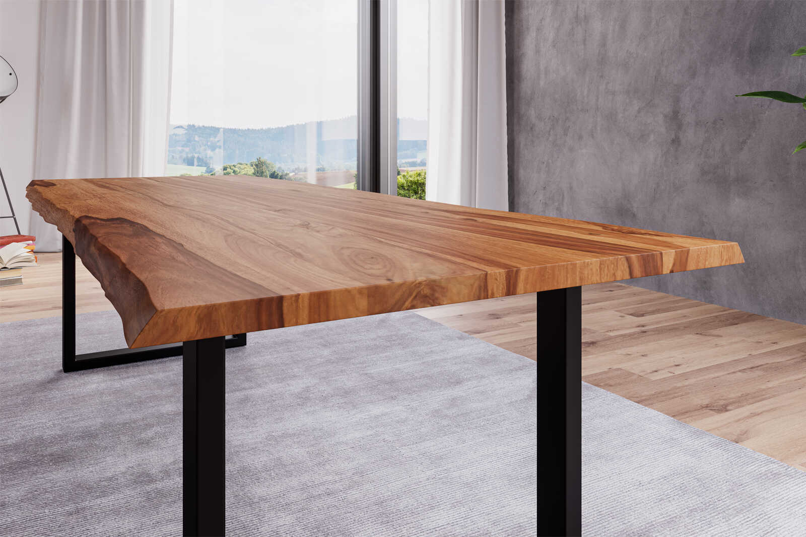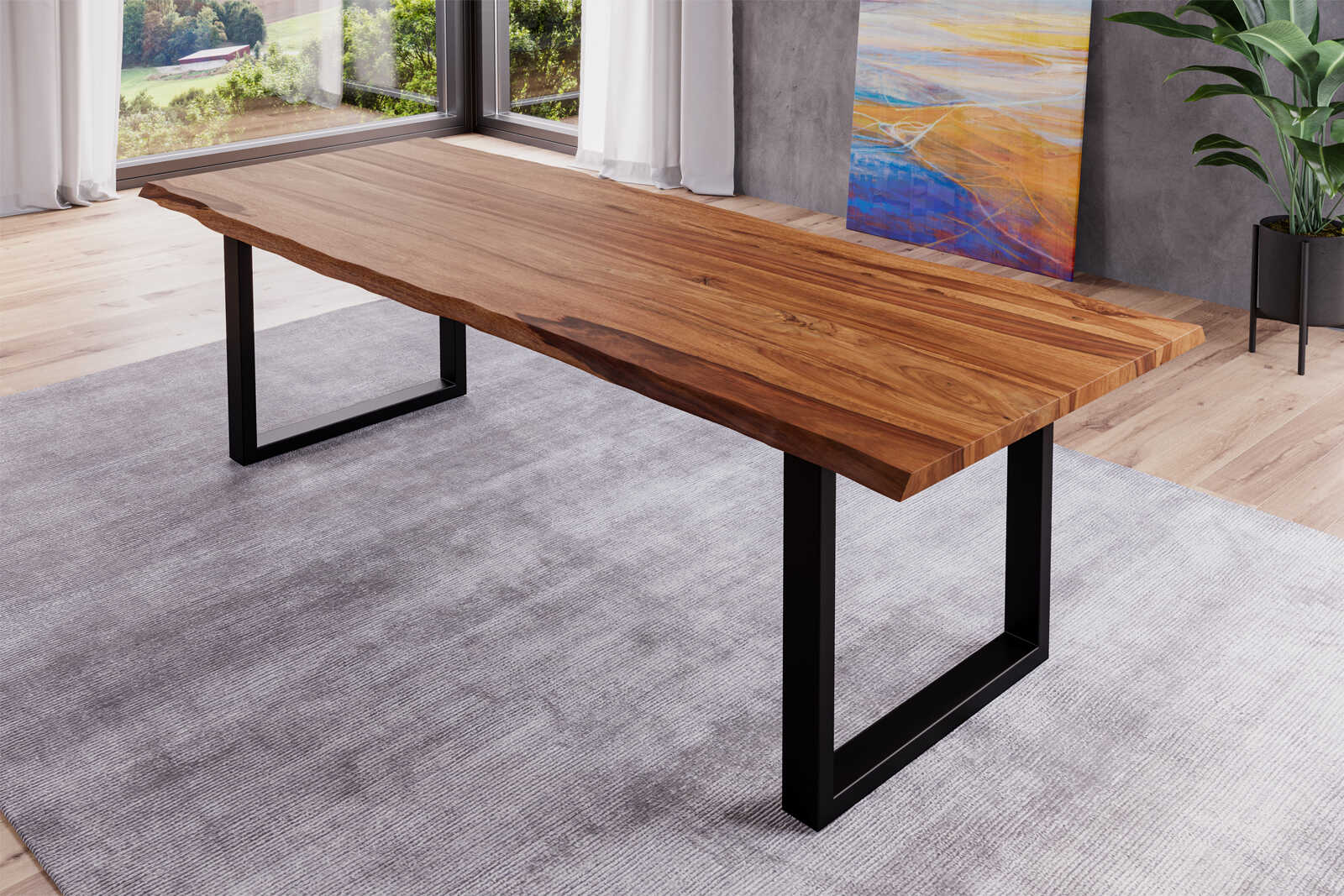 Baumkantentisch 220x100cm London, Sheesham-Holz Teakfarben gebeizt/Mattschwarz