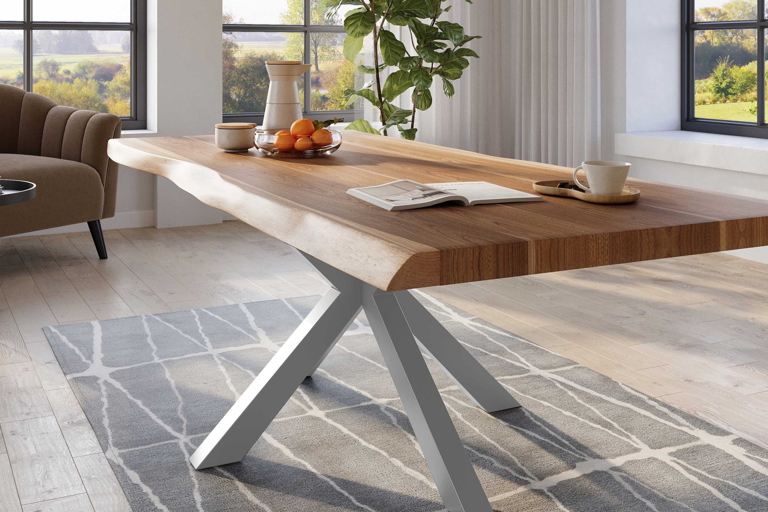 Esszimmertisch Titan | 240 x 110 cm | Akazienholz massiv & naturfarben | Spider-Gestell Metall Silber| echte Baumkante