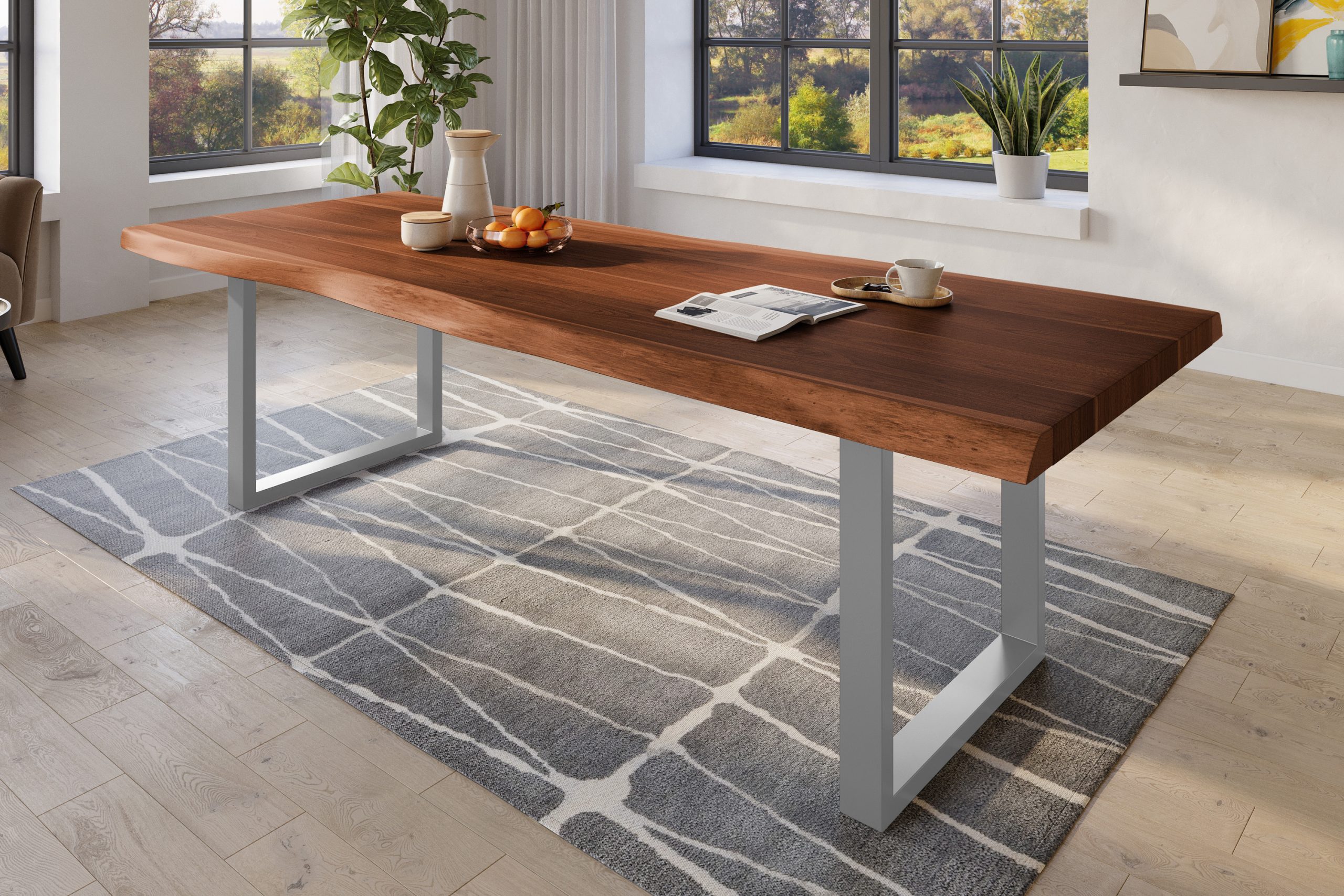 Esszimmertisch Titan | 280 x 110 cm | Akazienholz massiv & nussbaumfarben | U-Gestell Metall Silber | echte Baumkante
