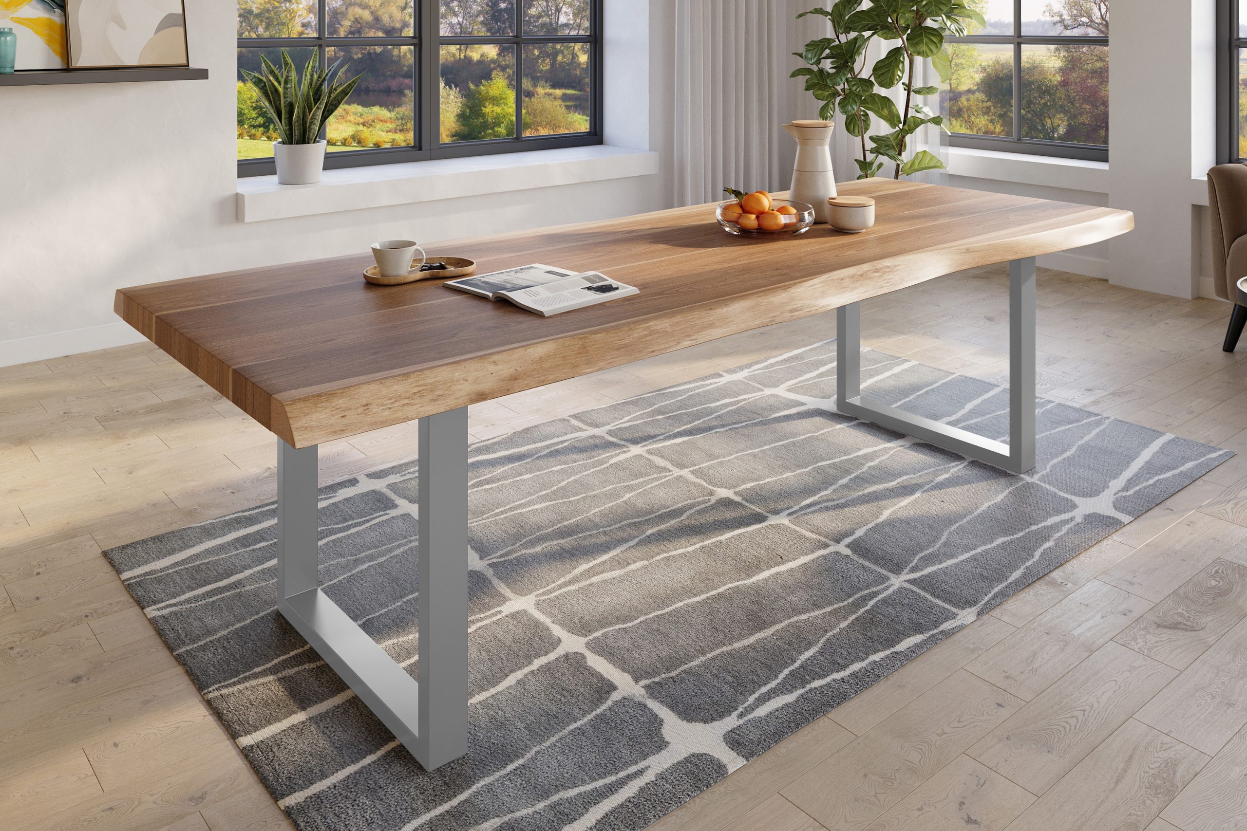 Esszimmertisch Titan | 280 x 120 cm | Akazienholz massiv & naturfarben | U-Gestell Metall Silber | echte Baumkante