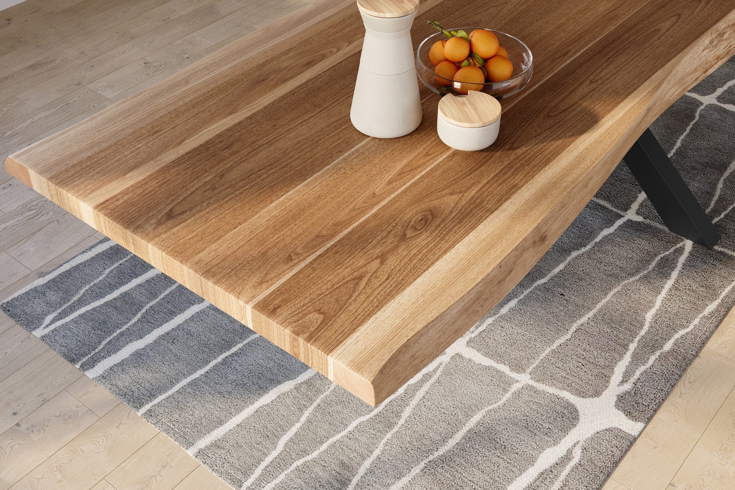 - Unterschiedliche Kantenausprägungen, Maserungen sowie Farbnuancen machen jeden Tisch zum Einzelstück.