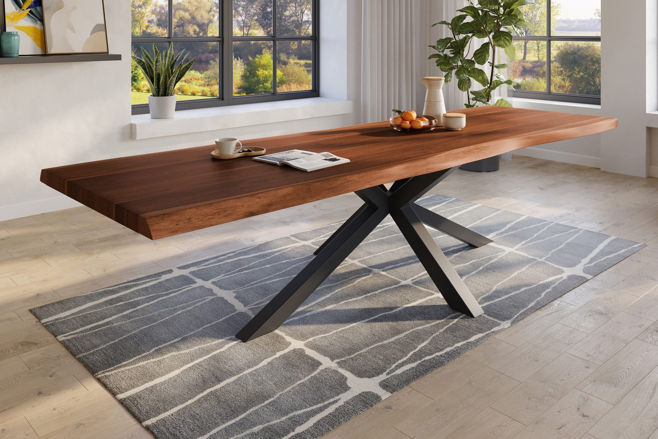 Esszimmertisch Titan | 300 x 120 cm | Akazienholz massiv & nussbaumfarben| Spider-Gestell Metall Schwarz | echte Baumkante