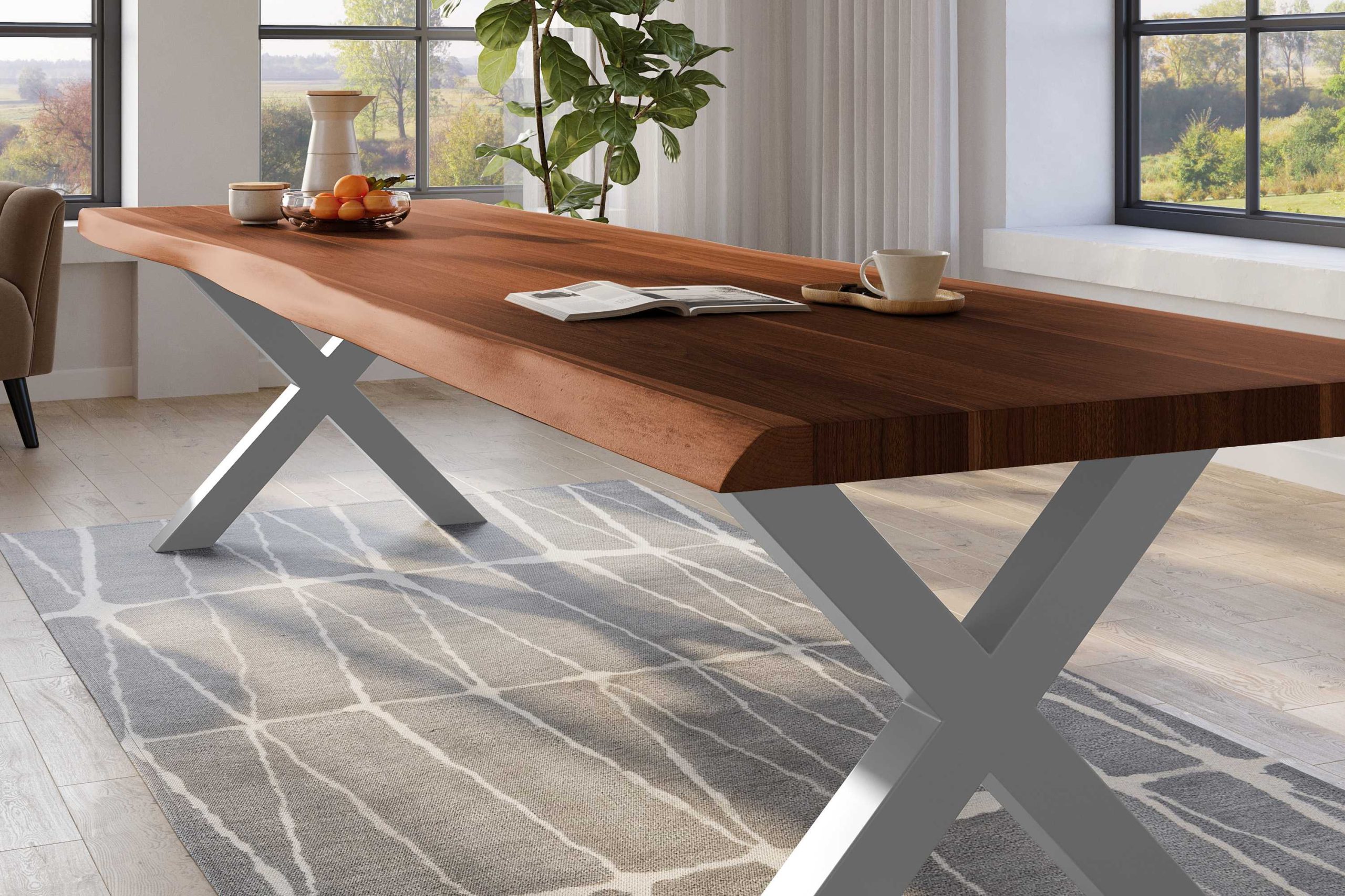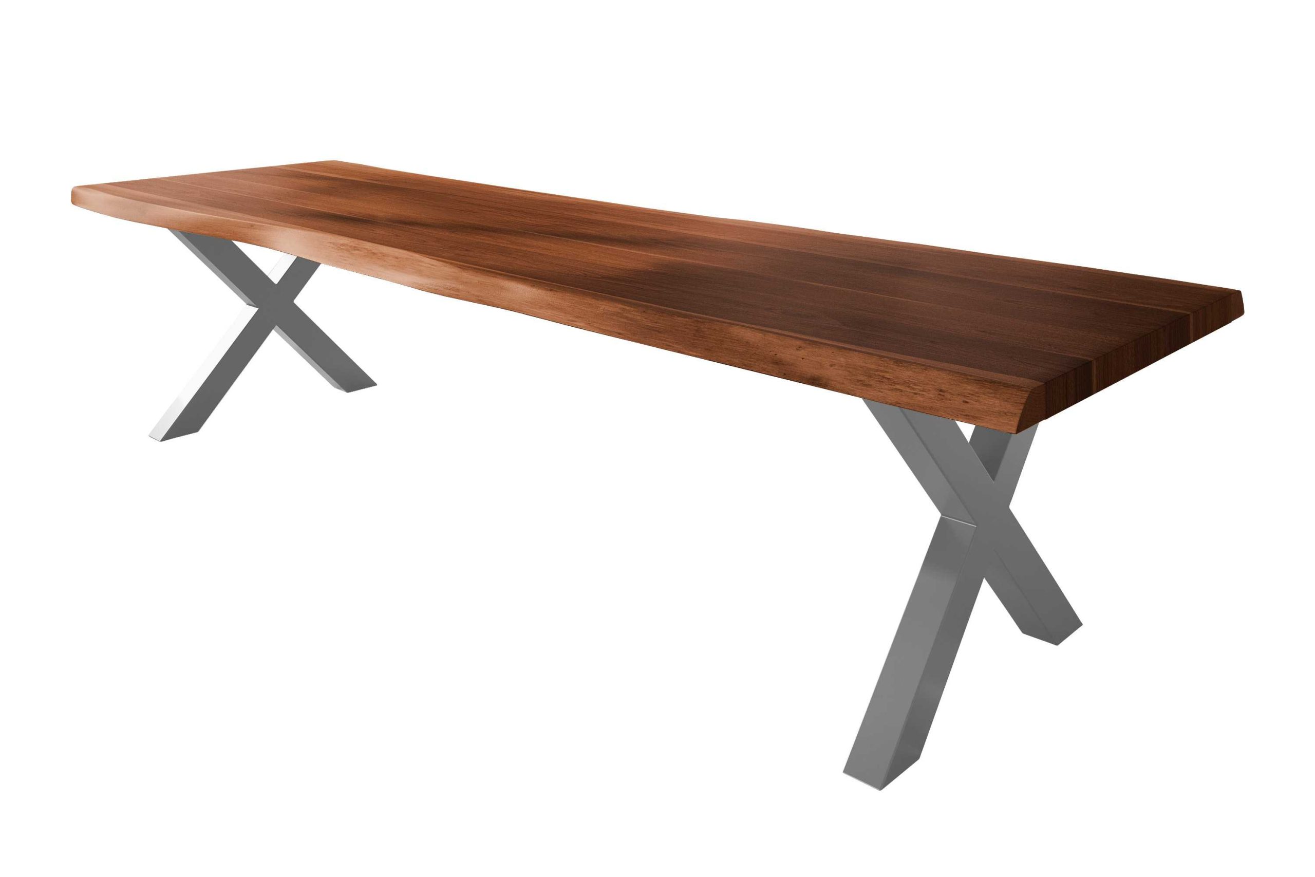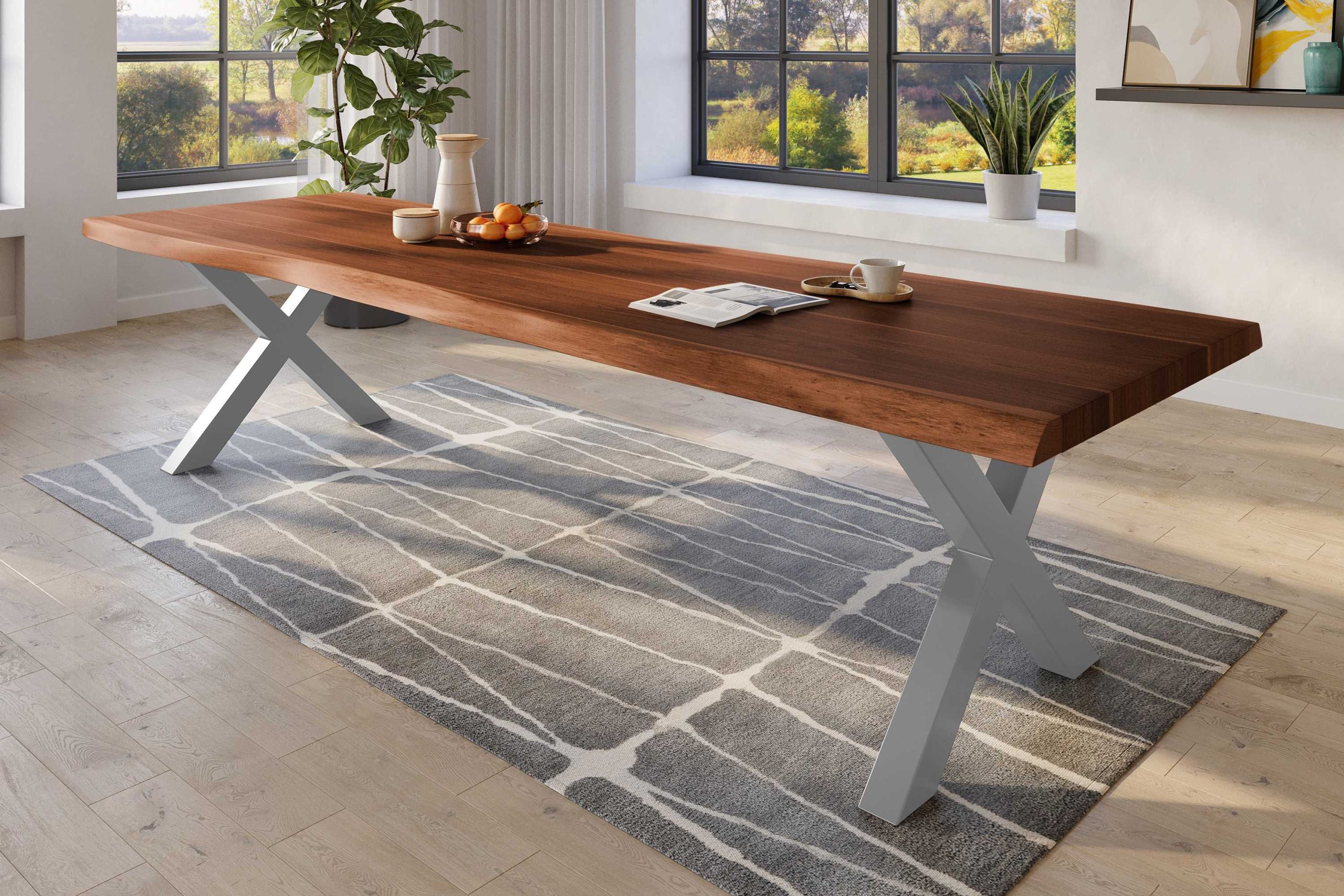 Esszimmertisch Titan | 400 x 120 cm | Akazienholz massiv & nussbaumfarben | X-Gestell Metall Silber | echte Baumkante
