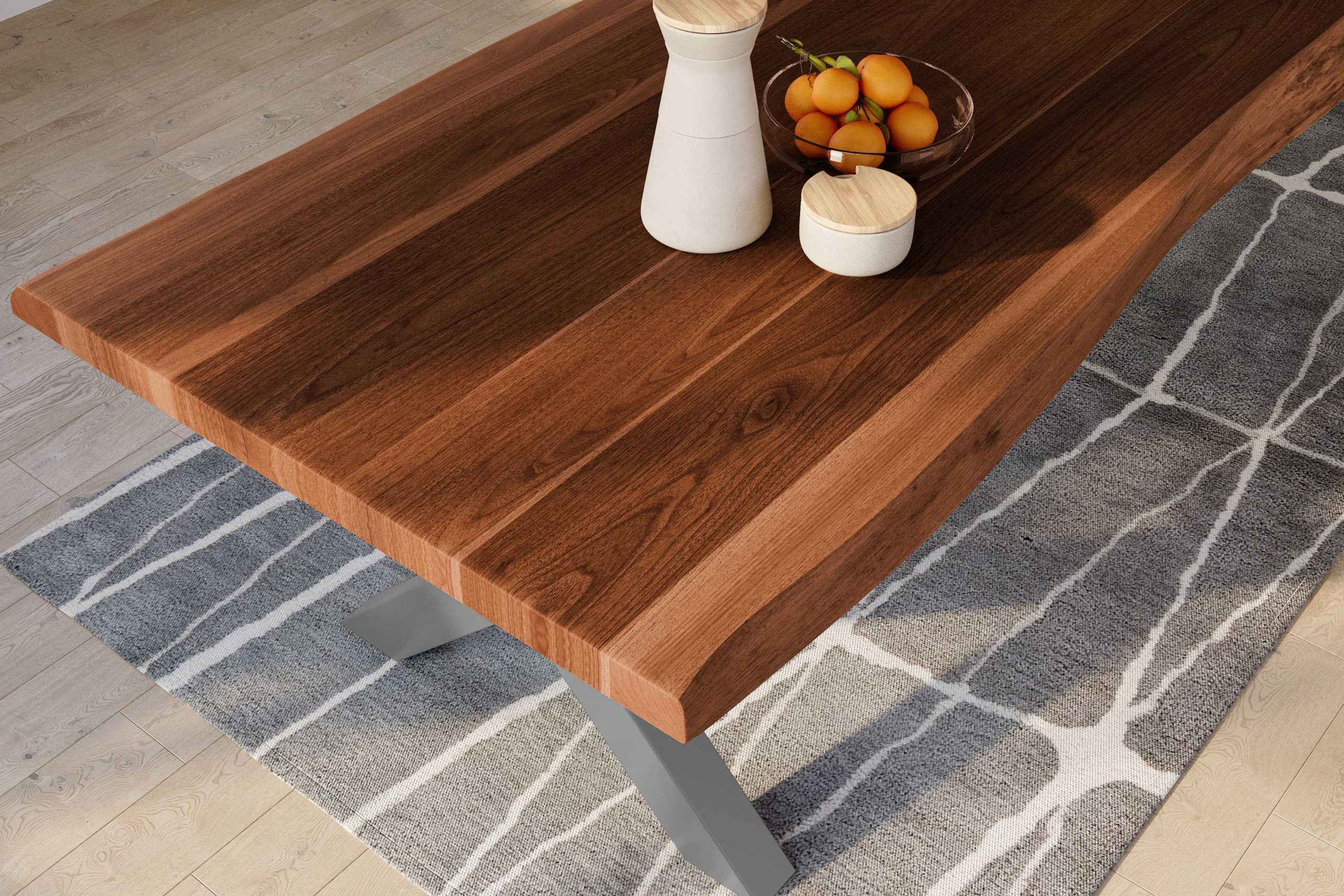 Das X-Gestell aus Metall bildet einen stilvollen Kontrast zum warmen Massivholz und sorgt für Stabilität sowie wackelfreien Stand. Dank der natürlichen Holzmerkmale wie Astlöchern und Farbnuancen erhält jeder Tisch einen individuellen Charakter. Perfekt für Liebhaber von exklusiven Möbelstücken.