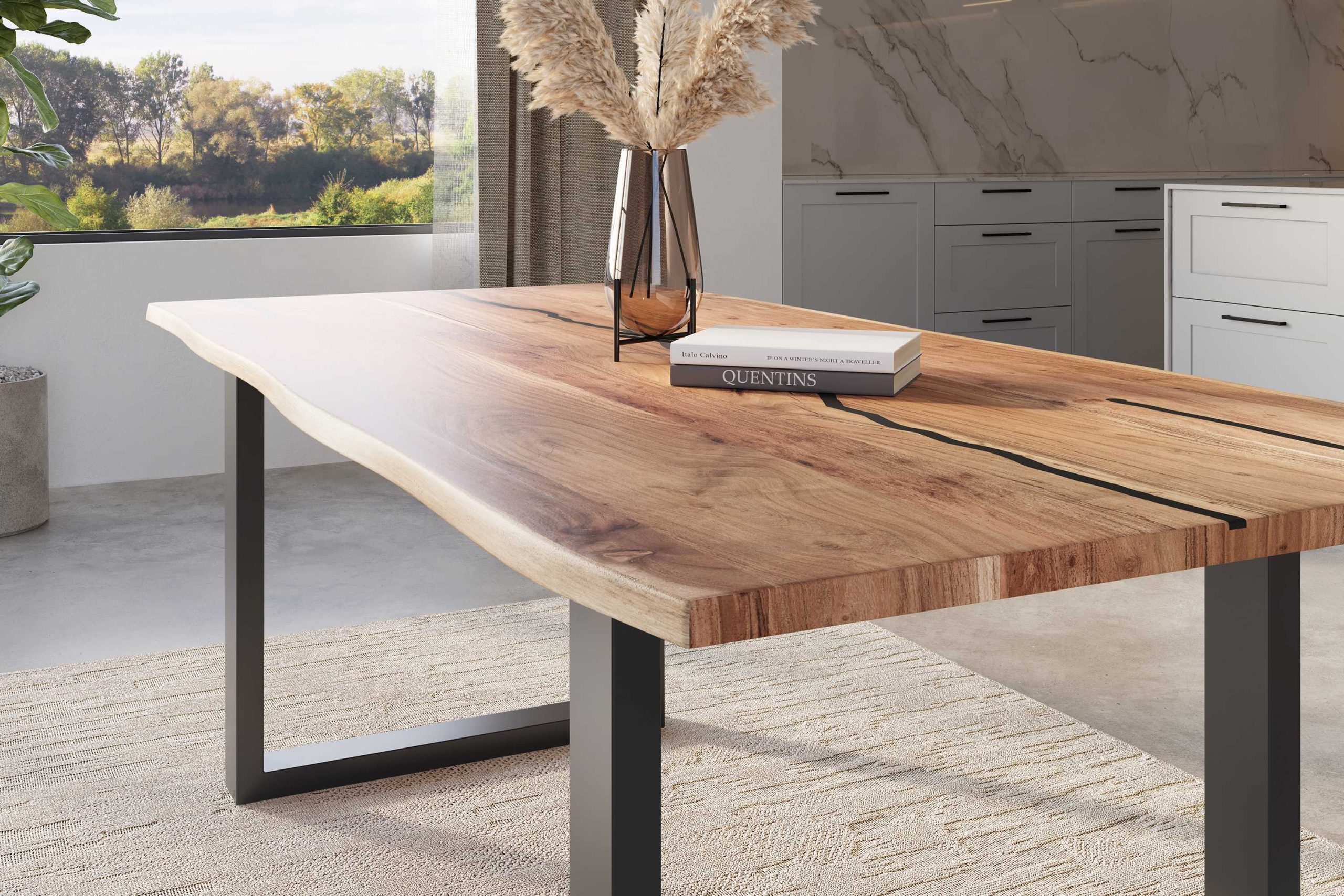 Exklusiver Esszimmertisch Polly, 200 x 100 cm, schwarze Resin-Adern, Akazienholz massiv + naturfarben, U-Metallgestell Schwarz, Tischplatte 26 mm