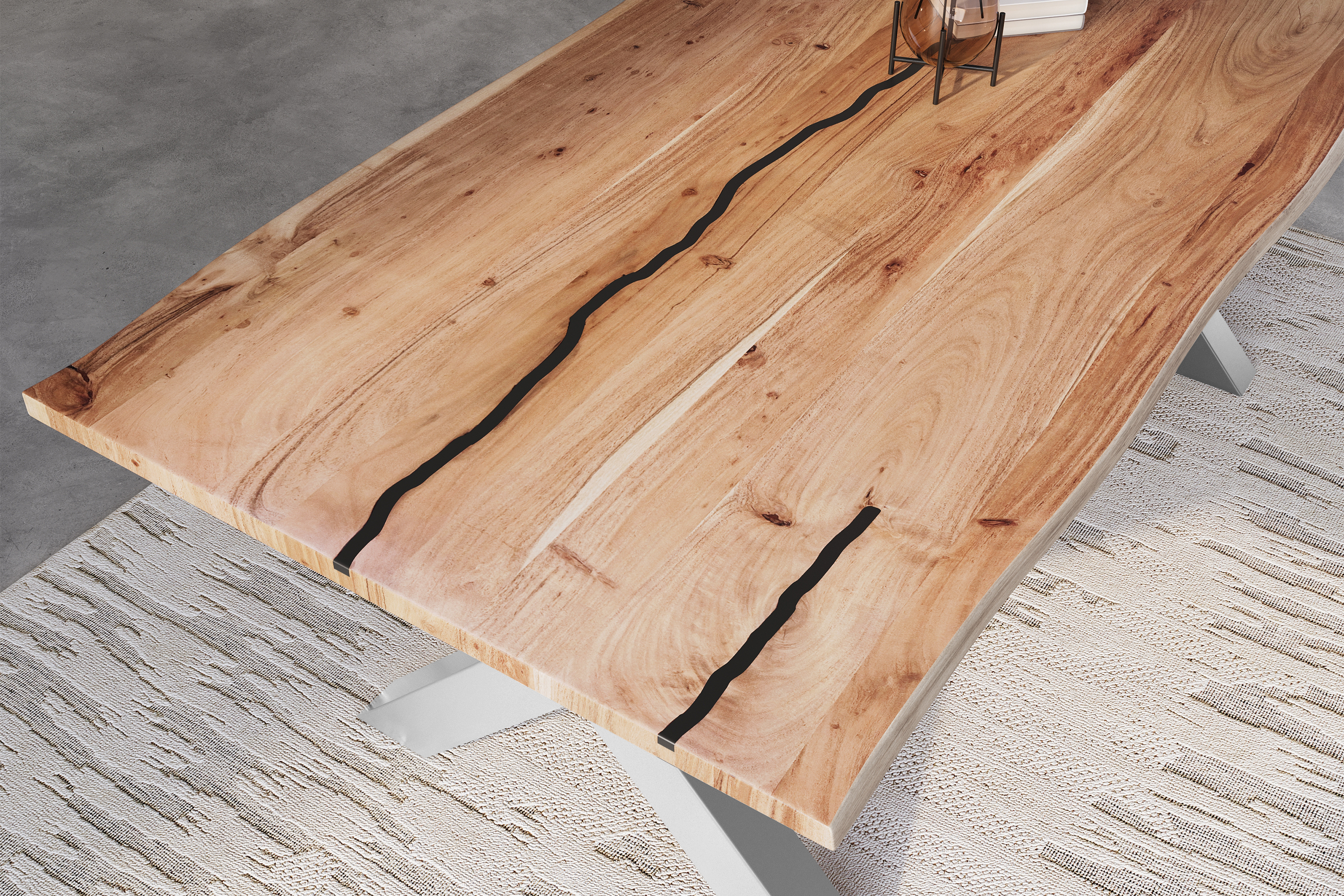 Exklusiver Esszimmertisch Polly, 200 x 100 cm, schwarze Resin-Adern, Akazienholz massiv + naturfarben, X-Metallgestell Silber, Tischplatte 26 mm