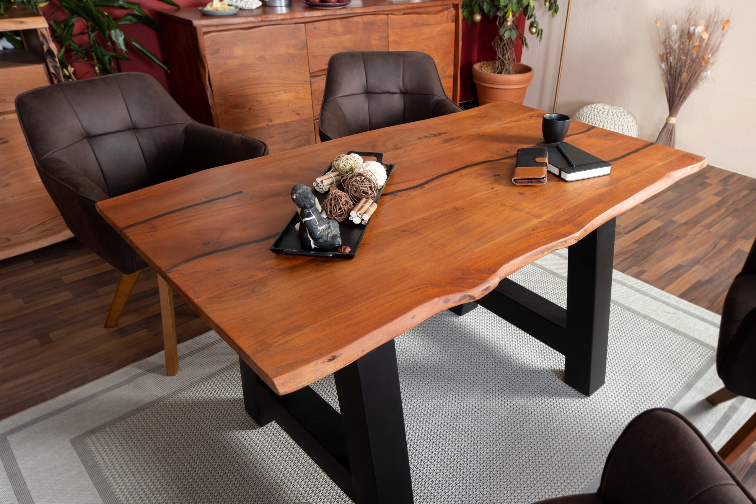 Exklusiver Esszimmertisch Polly, 140 x 80 cm, schwarze Resin-Adern, Akazienholz massiv + nussbaumfarben, A-Metallgestell Schwarz, Tischplatte 26 mm