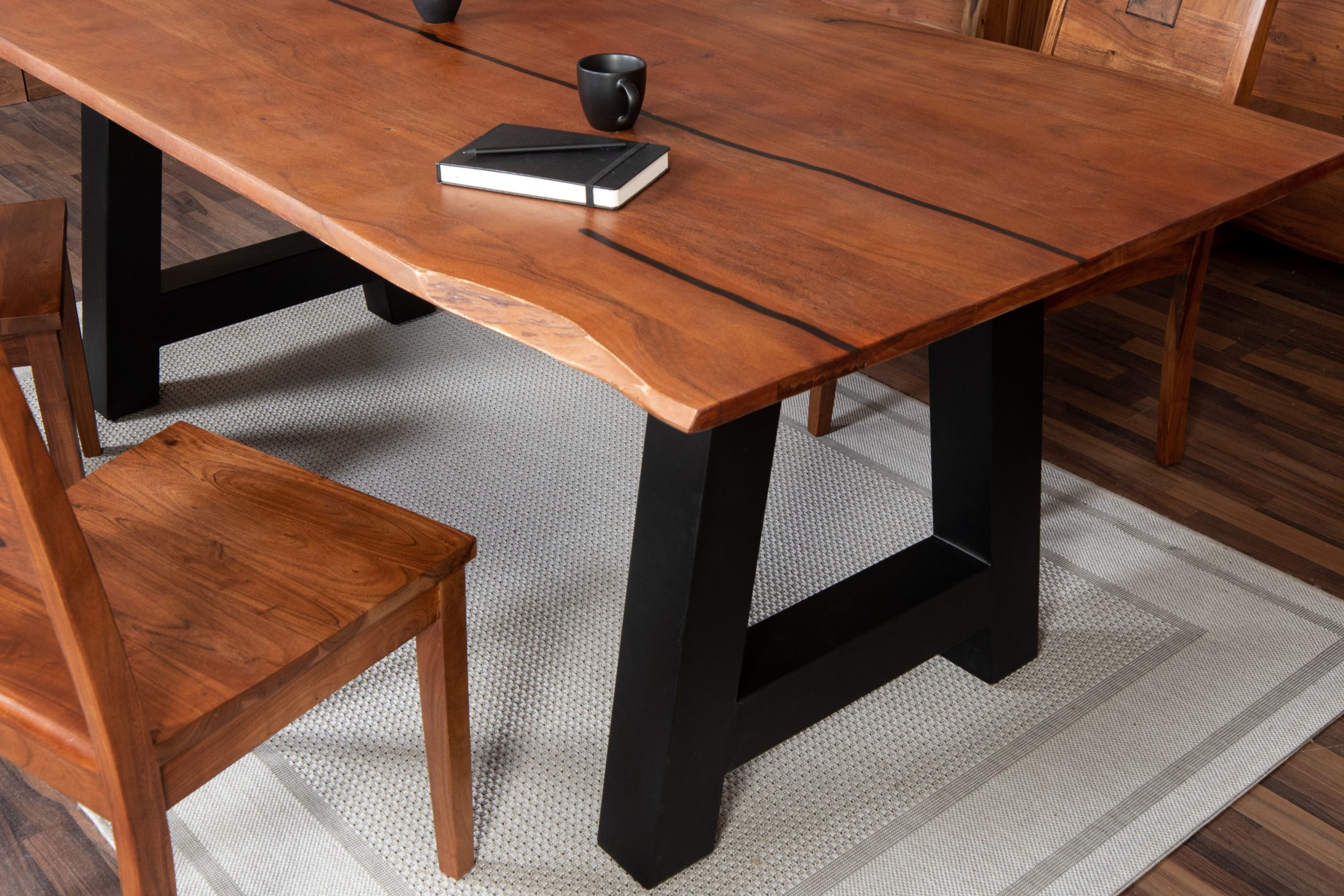 Baumkantentisch Akazie nussbaum mit schwarzen Resin-Adern 200 x 100 cm A-Gestell schwarz POLLY