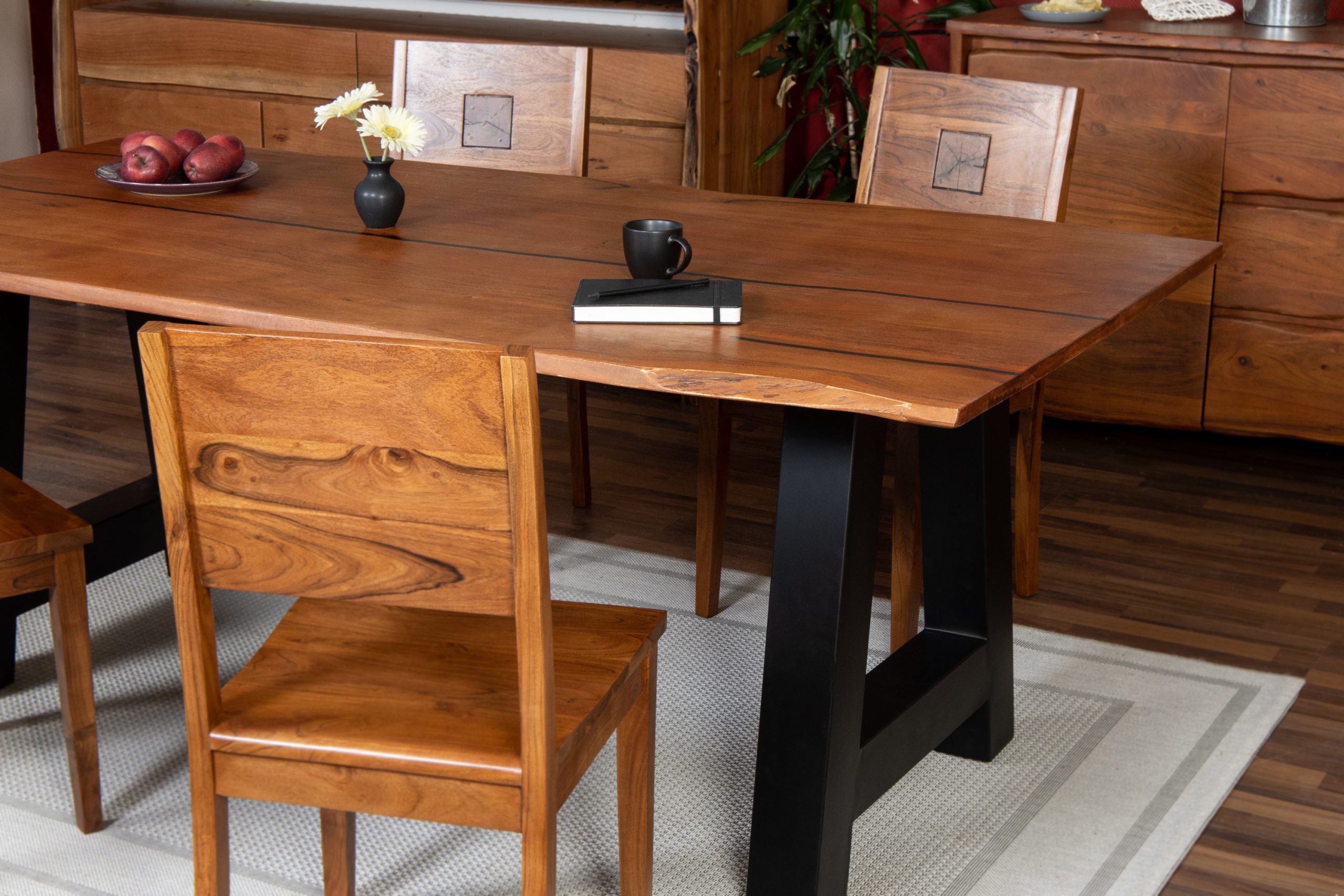 Schreibe die erste Rezension für „Baumkantentisch Akazie nussbaum mit schwarzen Resin-Adern 200 x 100 cm A-Gestell schwarz POLLY“