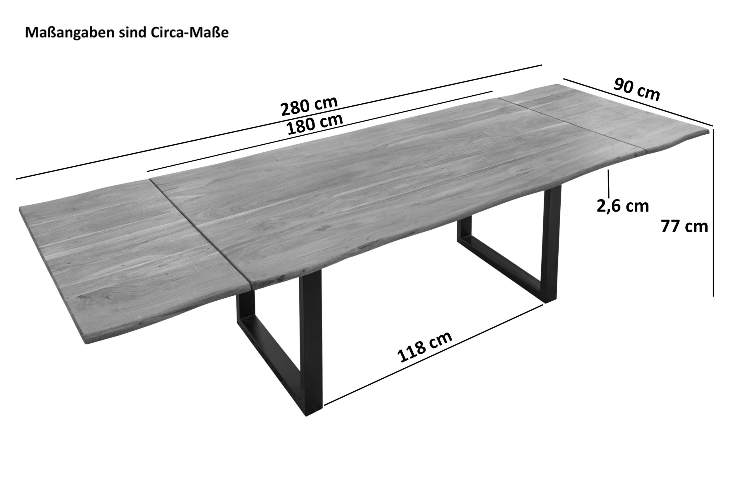 Baumkantentisch Norina | 180–280 x 90 cm | Akazienholz massiv stonefarben | U-Gestell Schwarz | Erweiterbar mit Ansteckplatten
