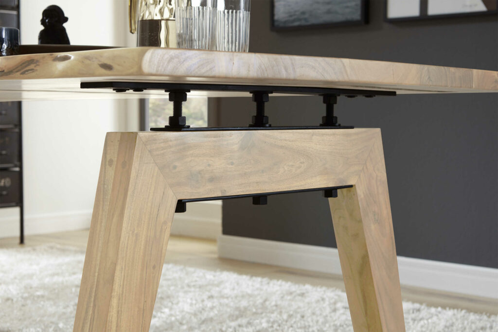 - Der 240×100 cm große Baumkantentisch beeindruckt durch seine 26 mm starke Holzplatte.