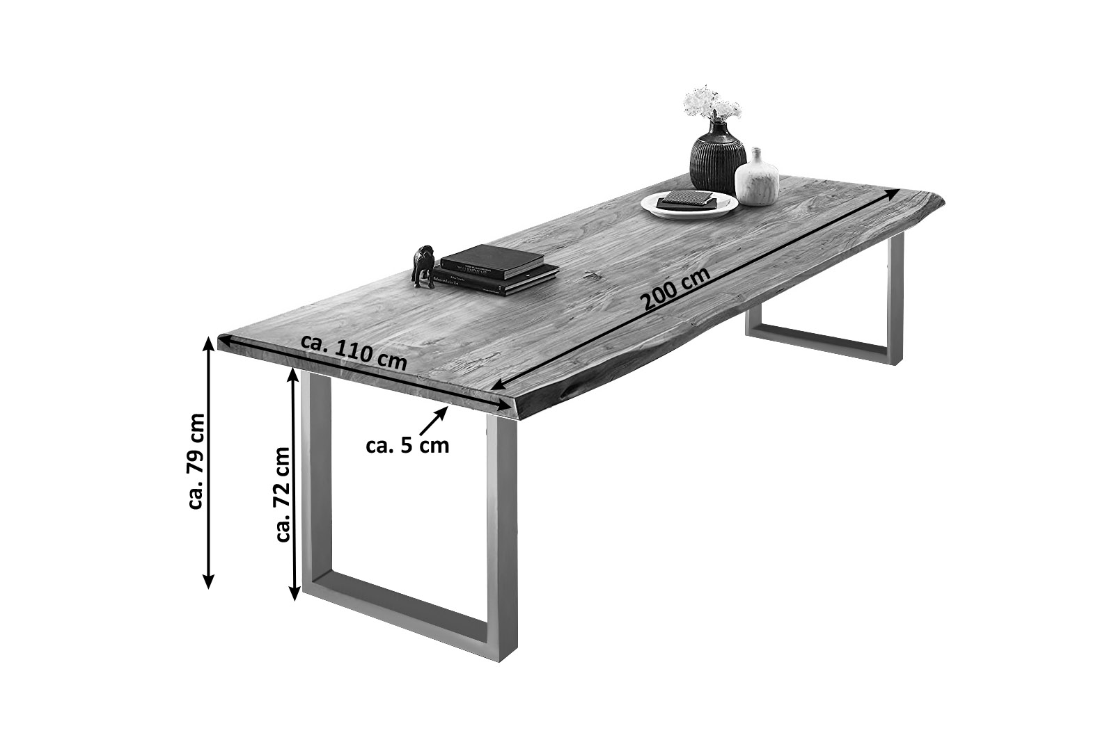 Baumkantentisch Valin | 200 x 110 cm | Akazienholz massiv naturfarben | U-Gestell Silber | Echte Baumkante | 5 cm starke Tischplatte