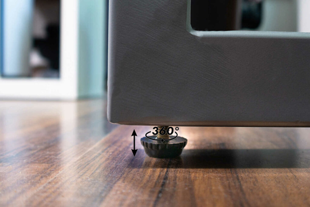 - Jedes Gestell besitzt zwei kleine heraus drehbare Füßchen an der Unterseite, um Unebenheiten auszugleichen.