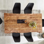 - Der 200×100 cm große Esszimmertisch mit echter Baumkante beeindruckt durch die raue und 26 mm dicke Holzplatte im Used-Look