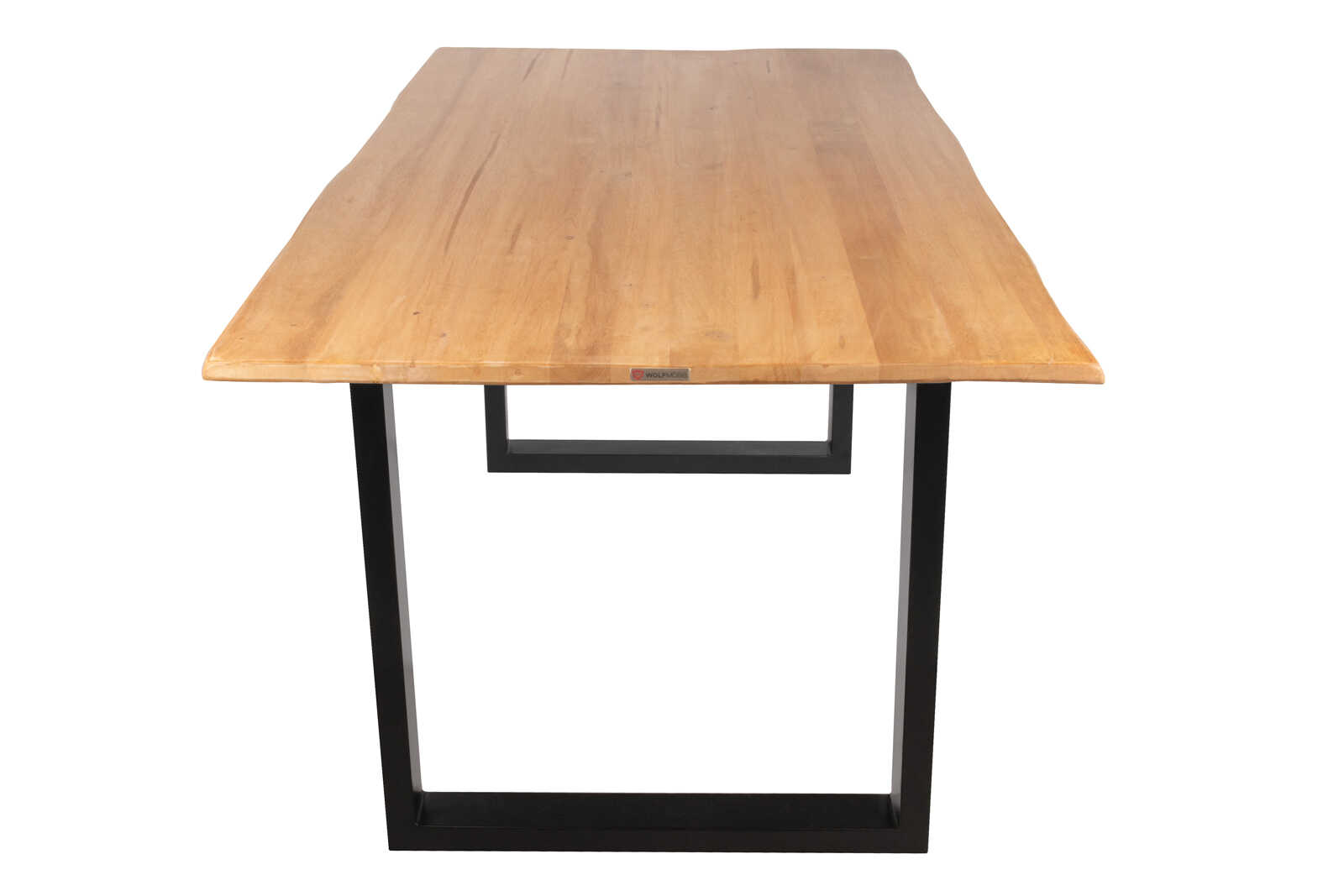 - Die Holzplatte ruht auf einem stabilen und schwarz lackierten Metallgestell in U-Form.