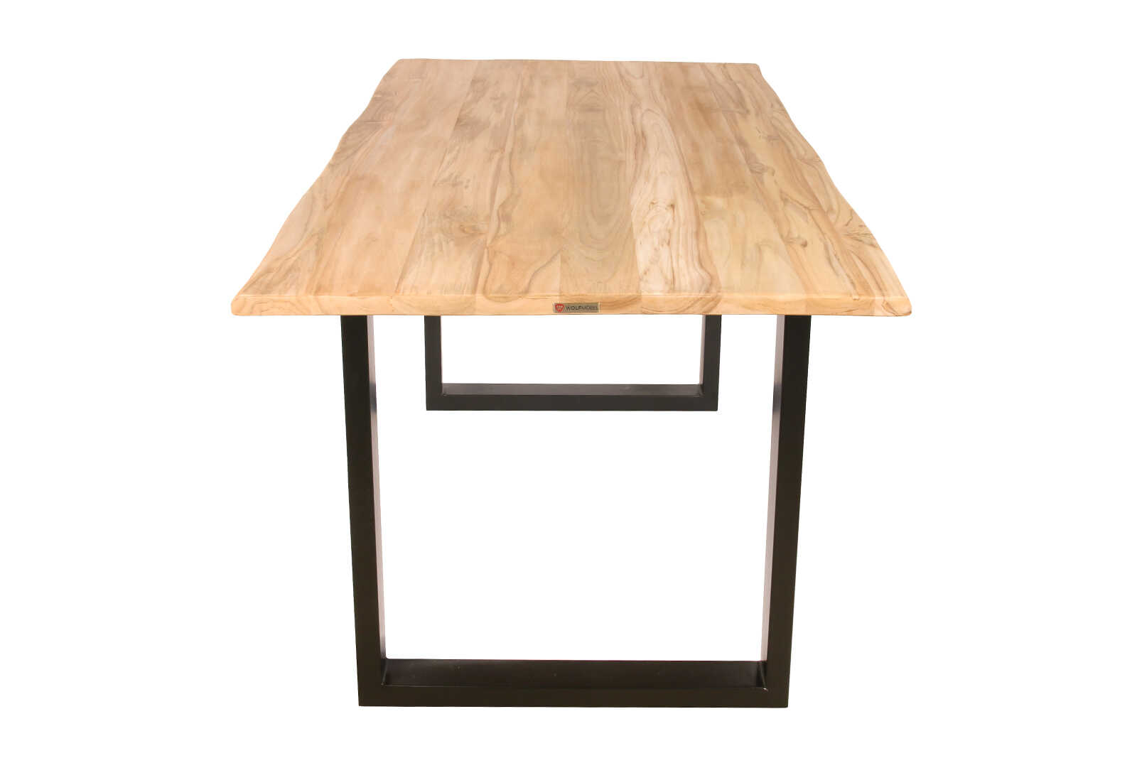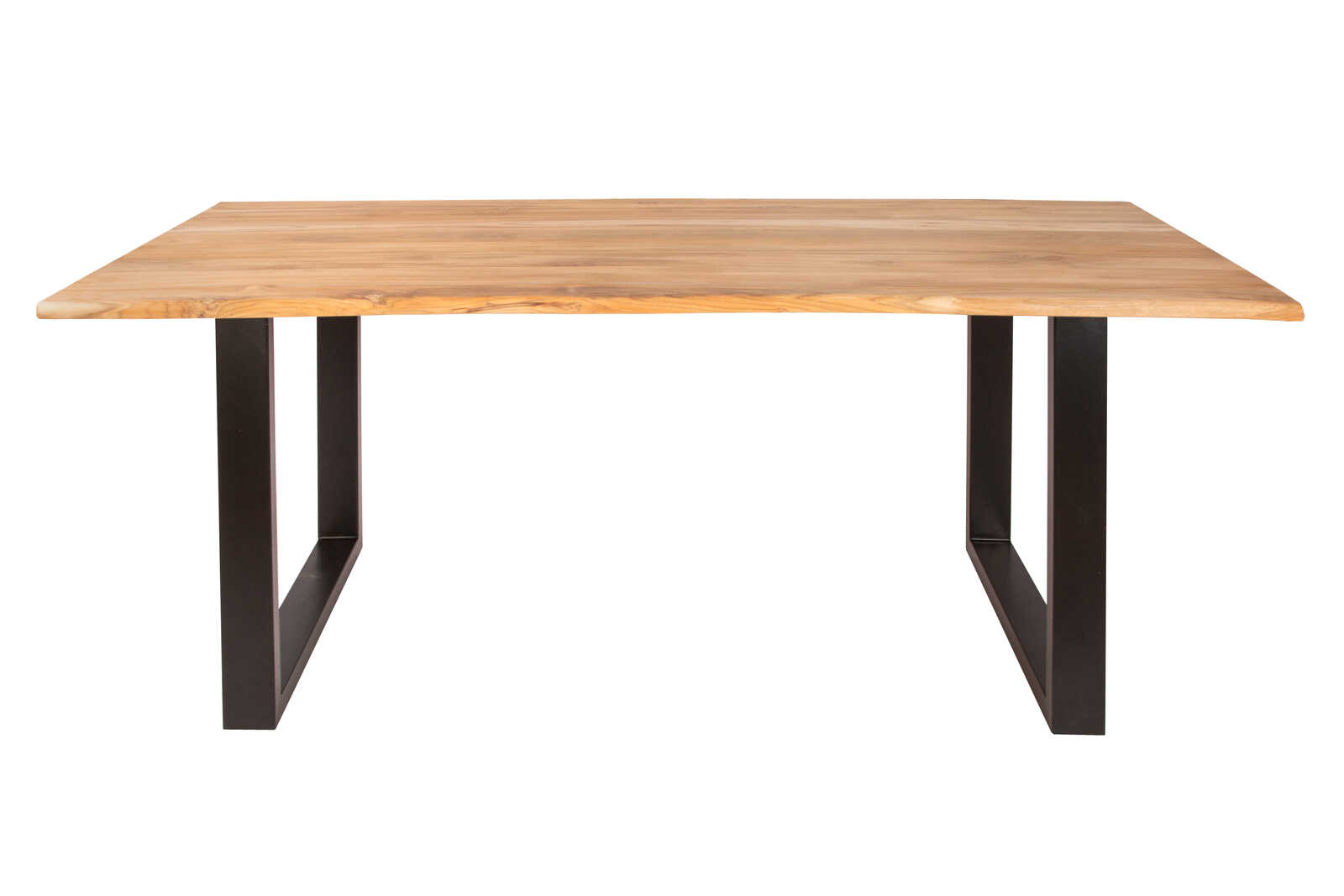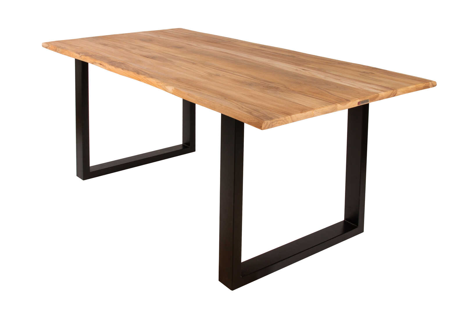 Stilvoller Baumkantentisch Matheo, Teakholz massiv + naturbelassen, 180x90cm, echte Baumkante, U-Gestell aus schwarz lackiertem Metall