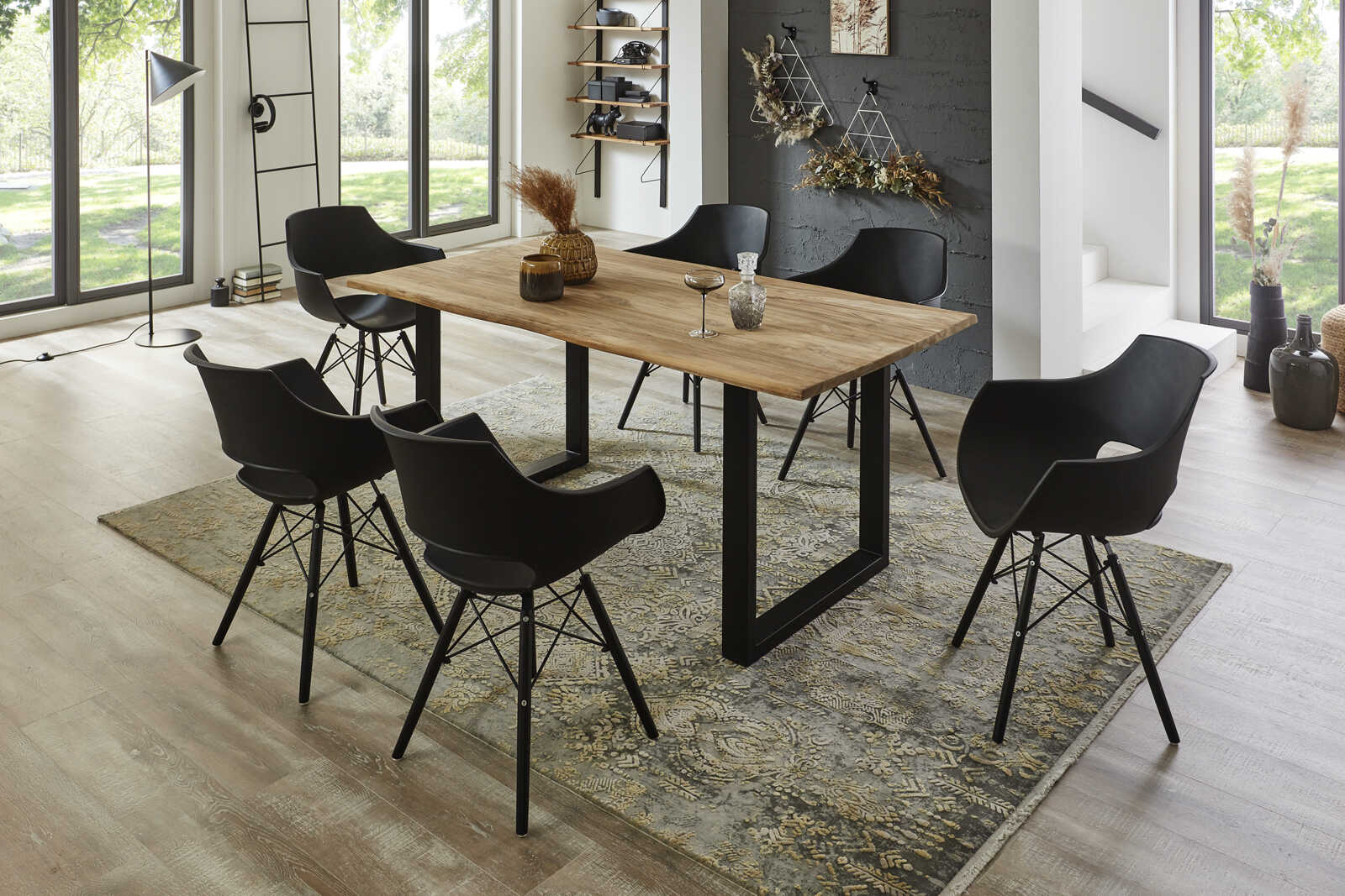 Der trendige Esstisch überzeugt durch eine perfekt gelungene Kombination aus Natürlichkeit und stylischer Moderne. Holen Sie sich dieses Unikat mit individuellem Charakter für Ihr Esszimmer.