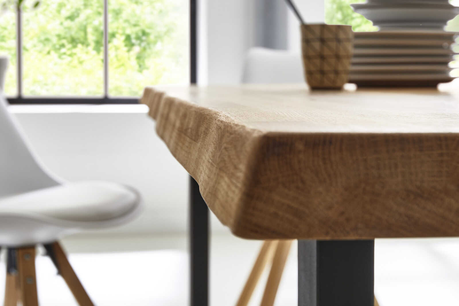 Baumkantentisch RICHARD, Esszimmertisch 160 x 85 cm, Wildeiche, schwarzes U-Gestell aus Metall