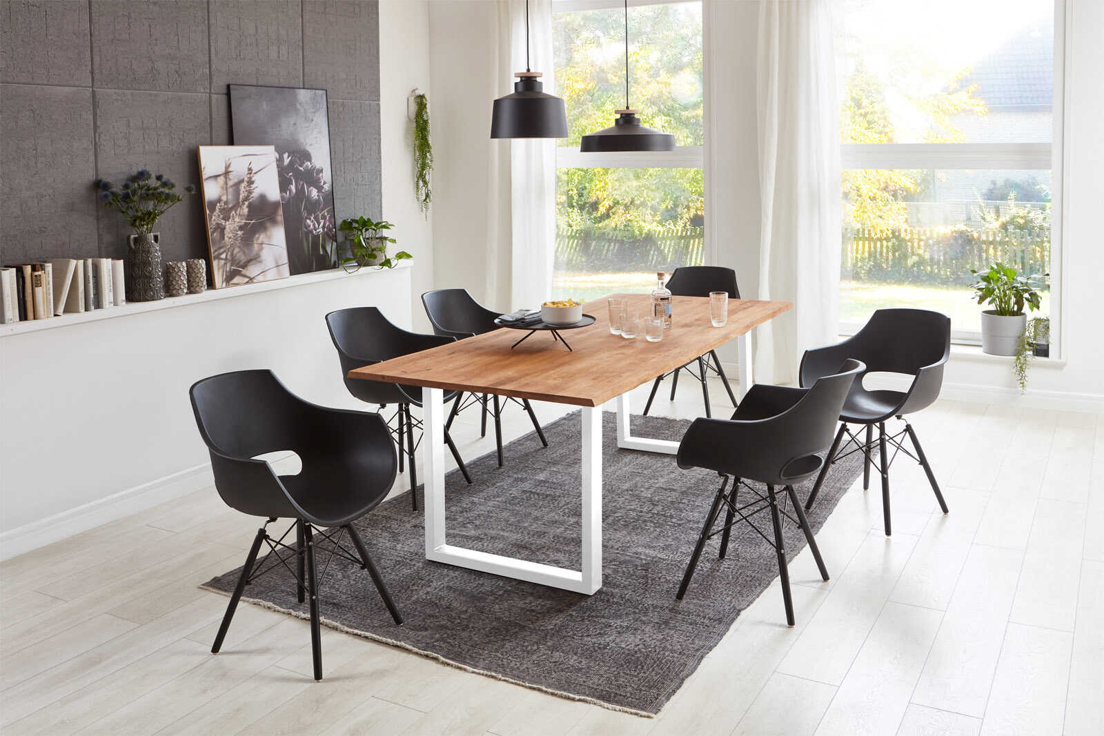Das zeitlose Design sorgt dafür, dass der trendige Holztisch auch morgen noch zeitgemäß und modisch wirkt. Der edle Baumtisch lässt sich problemlos mit verschiedenen Möbelstücken und Einrichtungsstilen kombinieren. Die Tischplatte ist aus massivem Eichenholz gefertigt und bietet Platz für die ganze Familie. Für eine hohe Standfestigkeit sorgen die stilgerechten und weißen Metallbeine in U-Form.